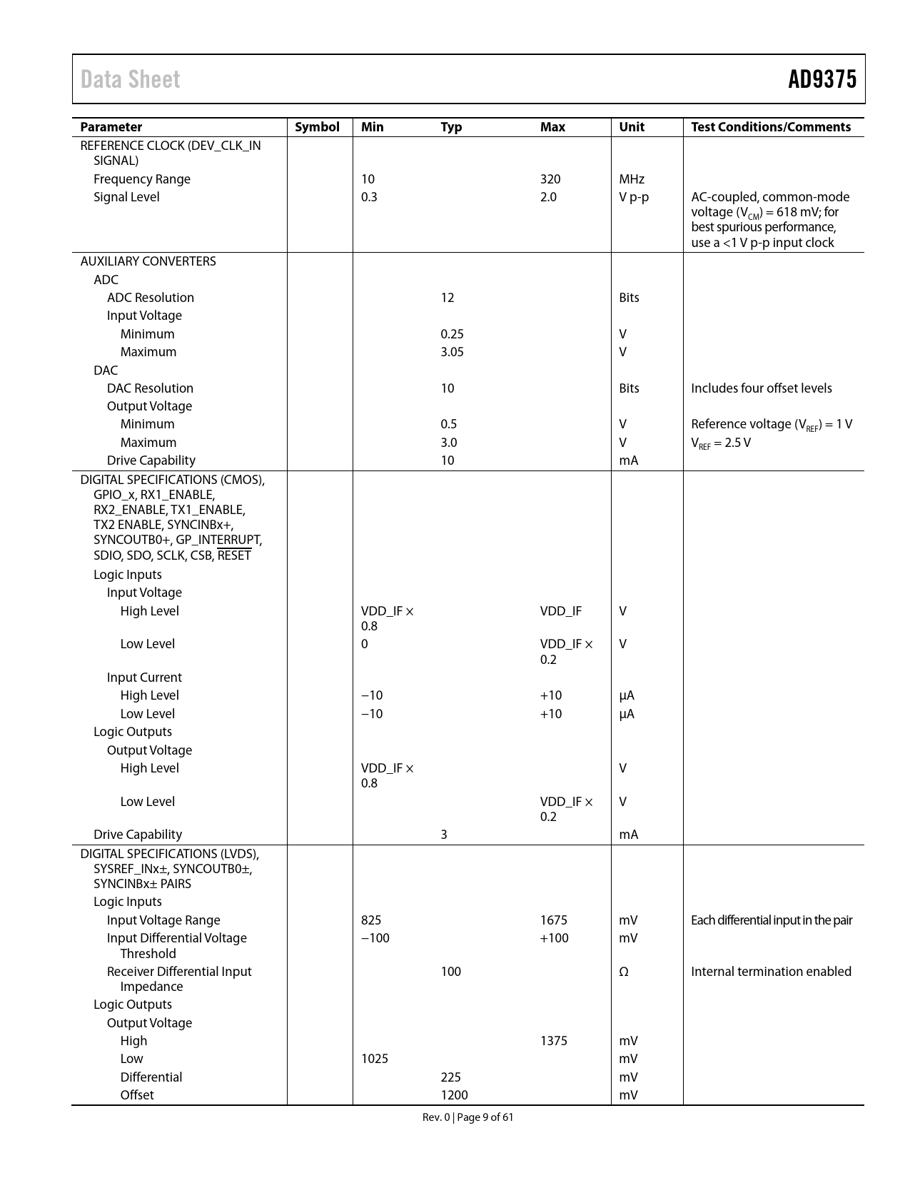 页数 / 页61 / 9 — Data Sheet. AD9375. Parameter. Symbol. Min. Typ. Max. Unit. Test …