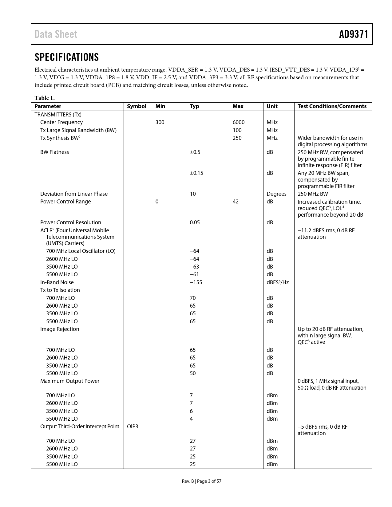 link to page 9 link to page 9 link to page 9 link to page 9 link to page 9 link to page 9 Data SheetAD9371SPECIFICATIONS Electrical characteristics at ambient temperature range, VDDA_SER = 1.3 V, VDDA_DES = 1.3 V, JESD_VTT_DES = 1.3 V, VDDA_1P31 = 1.3 V, VDIG = 1.3 V, VDDA_1P8 = 1.8 V, VDD_IF = 2.5 V, and VDDA_3P3 = 3.3 V; all RF specifications based on measurements that include printed circuit board (PCB) and matching circuit losses, unless otherwise noted. Table 1. Parameter SymbolMinTypMaxUnitTestConditions/Comments TRANSMITTERS (Tx) Center Frequency 300 6000 MHz Tx Large Signal Bandwidth (BW) 100 MHz Tx Synthesis BW2 250 MHz Wider bandwidth for use in digital processing algorithms BW Flatness ±0.5 dB 250 MHz BW, compensated by programmable finite infinite response (FIR) filter ±0.15 dB Any 20 MHz BW span, compensated by programmable FIR filter Deviation from Linear Phase 10 Degrees 250 MHz BW Power Control Range 0 42 dB Increased calibration time, reduced QEC3, LOL4 performance beyond 20 dB Power Control Resolution 0.05 dB ACLR5 (Four Universal Mobile −11.2 dBFS rms, 0 dB RF Telecommunications System attenuation (UMTS) Carriers) 700 MHz Local Oscillator (LO) −64 dB 2600 MHz LO −64 dB 3500 MHz LO −63 dB 5500 MHz LO −61 dB In-Band Noise −155 dBFS6/Hz Tx to Tx Isolation 700 MHz LO 70 dB 2600 MHz LO 65 dB 3500 MHz LO 65 dB 5500 MHz LO 65 dB Image Rejection Up to 20 dB RF attenuation, within large signal BW, QEC3 active 700 MHz LO 65 dB 2600 MHz LO 65 dB 3500 MHz LO 65 dB 5500 MHz LO 50 dB Maximum Output Power 0 dBFS, 1 MHz signal input, 50 Ω load, 0 dB RF attenuation 700 MHz LO 7 dBm 2600 MHz LO 7 dBm 3500 MHz LO 6 dBm 5500 MHz LO 4 dBm Output Third-Order Intercept Point OIP3 −5 dBFS rms, 0 dB RF attenuation 700 MHz LO 27 dBm 2600 MHz LO 27 dBm 3500 MHz LO 25 dBm 5500 MHz LO 25 dBm Rev. B | Page 3 of 57 Document Outline Features Applications General Description Functional Block Diagram Revision History Specifications Current and Power Consumption Specifications Timing Specifications Timing Diagrams Absolute Maximum Ratings Reflow Profile Thermal Resistance ESD Caution Pin Configuration and Function Descriptions Typical Performance Characteristics 700 MHz Band 2.6 GHz Band 3.5 GHz Band 5.5 GHz Band Theory of Operation Transmitter (Tx) Receiver (Rx) Observation Receiver (ORx) Sniffer Receiver (SnRx) Clock Input Synthesizers RF PLL Clock PLL External LO Inputs Serial Peripheral Interface (SPI) Interface GPIO_x AND GPIO_3P3_x Pins Auxiliary Converters Auxiliary ADC Inputs (AUXADC_x) Auxiliary DACs (AUXDAC_x) JESD204B Data Interface Power Supply Sequence JTAG Boundary Scan Outline Dimensions Ordering Guide