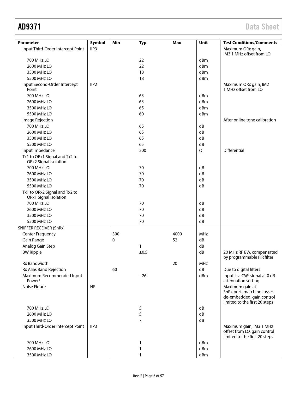 Input Third-Order Intercept Point IIP3 Maximum ORx gain, IM3 1 MHz offset from LO 700 MHz LO 22 dBm 2600 MHz LO 22 dBm 3500 MHz LO 18 dBm 5500 MHz LO 18 dBm Input Second-Order Intercept IIP2 Maximum ORx gain, IM2 Point 1 MHz offset from LO 700 MHz LO 65 dBm 2600 MHz LO 65 dBm 3500 MHz LO 65 dBm 5500 MHz LO 60 dBm Image Rejection After online tone calibration 700 MHz LO 65 dB 2600 MHz LO 65 dB 3500 MHz LO 65 dB 5500 MHz LO 65 dB Input Impedance 200 Ω Differential Tx1 to ORx1 Signal and Tx2 to ORx2 Signal Isolation 700 MHz LO 70 dB 2600 MHz LO 70 dB 3500 MHz LO 70 dB 5500 MHz LO 70 dB Tx1 to ORx2 Signal and Tx2 to ORx1 Signal Isolation 700 MHz LO 70 dB 2600 MHz LO 70 dB 3500 MHz LO 70 dB 5500 MHz LO 70 dB SNIFFER RECEIVER (SnRx) Center Frequency 300 4000 MHz Gain Range 0 52 dB Analog Gain Step 1 dB BW Ripple ±0.5 dB 20 MHz RF BW, compensated by programmable FIR filter Rx Bandwidth 20 MHz Rx Alias Band Rejection 60 dB Due to digital filters Maximum Recommended Input −26 dBm Input is a CW7 signal at 0 dB Power8 attenuation setting Noise Figure NF Maximum gain at SnRx port, matching losses de-embedded, gain control limited to the first 20 steps 700 MHz LO 5 dB 2600 MHz LO 5 dB 3500 MHz LO 7 dB Input Third-Order Intercept Point IIP3 Maximum gain, IM3 1 MHz offset from LO, gain control limited to the first 20 steps 700 MHz LO 1 dBm 2600 MHz LO 1 dBm 3500 MHz LO 1 dBm Rev. B | Page 6 of 57 Document Outline Features Applications General Description Functional Block Diagram Revision History Specifications Current and Power Consumption Specifications Timing Specifications Timing Diagrams Absolute Maximum Ratings Reflow Profile Thermal Resistance ESD Caution Pin Configuration and Function Descriptions Typical Performance Characteristics 700 MHz Band 2.6 GHz Band 3.5 GHz Band 5.5 GHz Band Theory of Operation Transmitter (Tx) Receiver (Rx) Observation Receiver (ORx) Sniffer Receiver (SnRx) Clock Input Synthesizers RF PLL Clock PLL External LO Inputs Serial Peripheral Interface (SPI) Interface GPIO_x AND GPIO_3P3_x Pins Auxiliary Converters Auxiliary ADC Inputs (AUXADC_x) Auxiliary DACs (AUXDAC_x) JESD204B Data Interface Power Supply Sequence JTAG Boundary Scan Outline Dimensions Ordering Guide