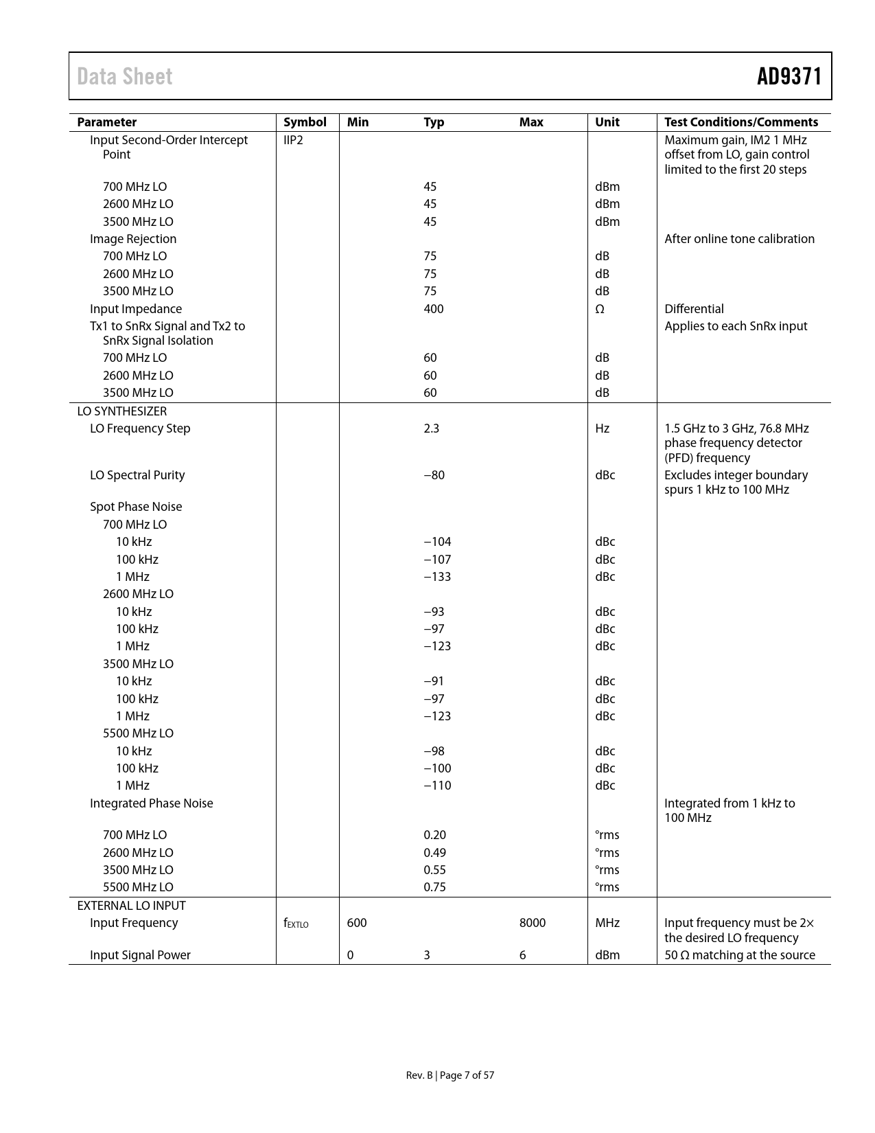 Input Second-Order Intercept IIP2 Maximum gain, IM2 1 MHz Point offset from LO, gain control limited to the first 20 steps 700 MHz LO 45 dBm 2600 MHz LO 45 dBm 3500 MHz LO 45 dBm Image Rejection After online tone calibration 700 MHz LO 75 dB 2600 MHz LO 75 dB 3500 MHz LO 75 dB Input Impedance 400 Ω Differential Tx1 to SnRx Signal and Tx2 to Applies to each SnRx input SnRx Signal Isolation 700 MHz LO 60 dB 2600 MHz LO 60 dB 3500 MHz LO 60 dB LO SYNTHESIZER LO Frequency Step 2.3 Hz 1.5 GHz to 3 GHz, 76.8 MHz phase frequency detector (PFD) frequency LO Spectral Purity −80 dBc Excludes integer boundary spurs 1 kHz to 100 MHz Spot Phase Noise 700 MHz LO 10 kHz −104 dBc 100 kHz −107 dBc 1 MHz −133 dBc 2600 MHz LO 10 kHz −93 dBc 100 kHz −97 dBc 1 MHz −123 dBc 3500 MHz LO 10 kHz −91 dBc 100 kHz −97 dBc 1 MHz −123 dBc 5500 MHz LO 10 kHz −98 dBc 100 kHz −100 dBc 1 MHz −110 dBc Integrated Phase Noise Integrated from 1 kHz to 100 MHz 700 MHz LO 0.20 °rms 2600 MHz LO 0.49 °rms 3500 MHz LO 0.55 °rms 5500 MHz LO 0.75 °rms EXTERNAL LO INPUT Input Frequency fEXTLO 600 8000 MHz Input frequency must be 2× the desired LO frequency Input Signal Power 0 3 6 dBm 50 Ω matching at the source Rev. B | Page 7 of 57 Document Outline Features Applications General Description Functional Block Diagram Revision History Specifications Current and Power Consumption Specifications Timing Specifications Timing Diagrams Absolute Maximum Ratings Reflow Profile Thermal Resistance ESD Caution Pin Configuration and Function Descriptions Typical Performance Characteristics 700 MHz Band 2.6 GHz Band 3.5 GHz Band 5.5 GHz Band Theory of Operation Transmitter (Tx) Receiver (Rx) Observation Receiver (ORx) Sniffer Receiver (SnRx) Clock Input Synthesizers RF PLL Clock PLL External LO Inputs Serial Peripheral Interface (SPI) Interface GPIO_x AND GPIO_3P3_x Pins Auxiliary Converters Auxiliary ADC Inputs (AUXADC_x) Auxiliary DACs (AUXDAC_x) JESD204B Data Interface Power Supply Sequence JTAG Boundary Scan Outline Dimensions Ordering Guide