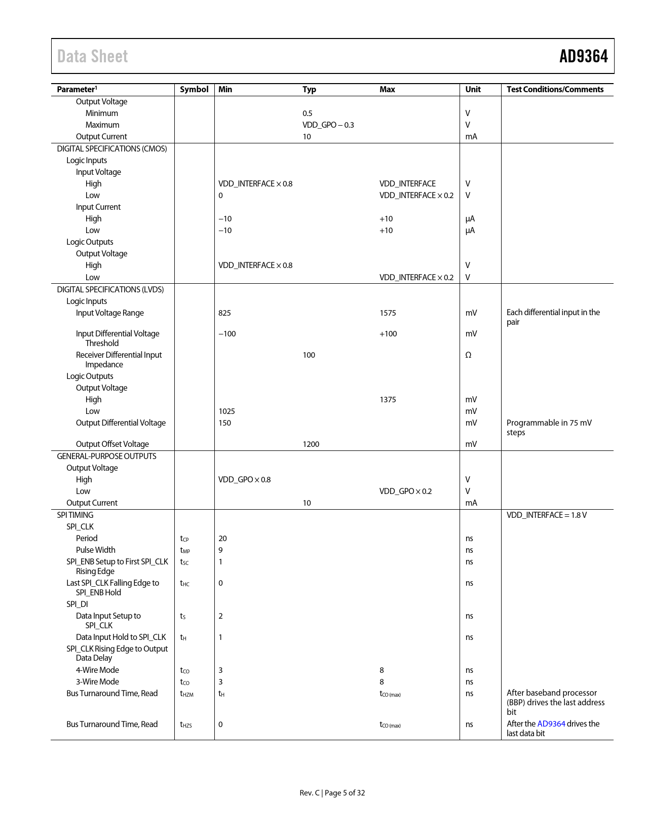 link to page 7 Data SheetAD9364Parameter1Symbol MinTypMaxUnitTest Conditions/Comments Output Voltage Minimum 0.5 V Maximum VDD_GPO − 0.3 V Output Current 10 mA DIGITAL SPECIFICATIONS (CMOS) Logic Inputs Input Voltage High VDD_INTERFACE × 0.8 VDD_INTERFACE V Low 0 VDD_INTERFACE × 0.2 V Input Current High −10 +10 μA Low −10 +10 μA Logic Outputs Output Voltage High VDD_INTERFACE × 0.8 V Low VDD_INTERFACE × 0.2 V DIGITAL SPECIFICATIONS (LVDS) Logic Inputs Input Voltage Range 825 1575 mV Each differential input in the pair Input Differential Voltage −100 +100 mV Threshold Receiver Differential Input 100 Ω Impedance Logic Outputs Output Voltage High 1375 mV Low 1025 mV Output Differential Voltage 150 mV Programmable in 75 mV steps Output Offset Voltage 1200 mV GENERAL-PURPOSE OUTPUTS Output Voltage High VDD_GPO × 0.8 V Low VDD_GPO × 0.2 V Output Current 10 mA SPI TIMING VDD_INTERFACE = 1.8 V SPI_CLK Period tCP 20 ns Pulse Width tMP 9 ns SPI_ENB Setup to First SPI_CLK tSC 1 ns Rising Edge Last SPI_CLK Fal ing Edge to tHC 0 ns SPI_ENB Hold SPI_DI Data Input Setup to tS 2 ns SPI_CLK Data Input Hold to SPI_CLK tH 1 ns SPI_CLK Rising Edge to Output Data Delay 4-Wire Mode tCO 3 8 ns 3-Wire Mode tCO 3 8 ns Bus Turnaround Time, Read tHZM tH tCO (max) ns After baseband processor (BBP) drives the last address bit Bus Turnaround Time, Read tHZS 0 tCO (max) ns After the AD9364 drives the last data bit Rev. C | Page 5 of 32 Document Outline Features Applications Functional Block Diagram General Description Table of Contents Revision History Specifications Current Consumption—VDD_Interface Current Consumption—VDDD1P3_DIG and VDDAx (Combination of All 1.3 V Supplies) Absolute Maximum Ratings Reflow Profile Thermal Resistance ESD Caution Pin Configuration and Function Descriptions Typical Performance Characteristics 800 MHz Frequency Band 2.4 GHz Frequency Band 5.5 GHz Frequency Band Theory of Operation General Receiver Transmitter Clock Input Options Synthesizers RF PLLs BB PLL Digital Data Interface DATA_CLK Signal FB_CLK Signal RX_FRAME Signal Enable State Machine SPI Control Mode Pin Control Mode SPI Interface Control Pins Control Outputs (CTRL_OUT7 to CTRL_OUT0) Control Inputs (CTRL_IN3 to CTRL_IN0) GPO Pins (GPO_3 to GPO_0) Auxiliary Converters AUXADC AUXDAC1 and AUXDAC2 Powering the AD9364 Packaging and Ordering Information Outline Dimensions Ordering Guide