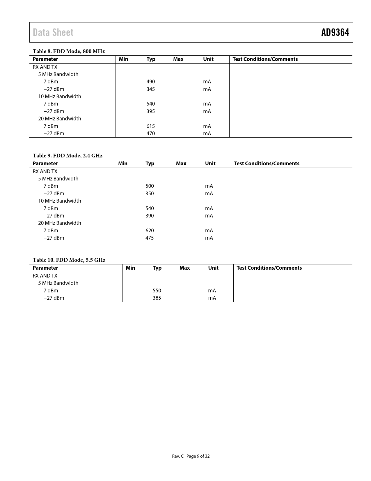 Data SheetAD9364Table 8. FDD Mode, 800 MHz ParameterMinTypMaxUnitTest Conditions/Comments RX AND TX 5 MHz Bandwidth 7 dBm 490 mA −27 dBm 345 mA 10 MHz Bandwidth 7 dBm 540 mA −27 dBm 395 mA 20 MHz Bandwidth 7 dBm 615 mA −27 dBm 470 mA Table 9. FDD Mode, 2.4 GHz ParameterMinTypMaxUnitTest Conditions/Comments RX AND TX 5 MHz Bandwidth 7 dBm 500 mA −27 dBm 350 mA 10 MHz Bandwidth 7 dBm 540 mA −27 dBm 390 mA 20 MHz Bandwidth 7 dBm 620 mA −27 dBm 475 mA Table 10. FDD Mode, 5.5 GHz ParameterMinTypMaxUnitTest Conditions/Comments RX AND TX 5 MHz Bandwidth 7 dBm 550 mA −27 dBm 385 mA Rev. C | Page 9 of 32 Document Outline Features Applications Functional Block Diagram General Description Table of Contents Revision History Specifications Current Consumption—VDD_Interface Current Consumption—VDDD1P3_DIG and VDDAx (Combination of All 1.3 V Supplies) Absolute Maximum Ratings Reflow Profile Thermal Resistance ESD Caution Pin Configuration and Function Descriptions Typical Performance Characteristics 800 MHz Frequency Band 2.4 GHz Frequency Band 5.5 GHz Frequency Band Theory of Operation General Receiver Transmitter Clock Input Options Synthesizers RF PLLs BB PLL Digital Data Interface DATA_CLK Signal FB_CLK Signal RX_FRAME Signal Enable State Machine SPI Control Mode Pin Control Mode SPI Interface Control Pins Control Outputs (CTRL_OUT7 to CTRL_OUT0) Control Inputs (CTRL_IN3 to CTRL_IN0) GPO Pins (GPO_3 to GPO_0) Auxiliary Converters AUXADC AUXDAC1 and AUXDAC2 Powering the AD9364 Packaging and Ordering Information Outline Dimensions Ordering Guide
