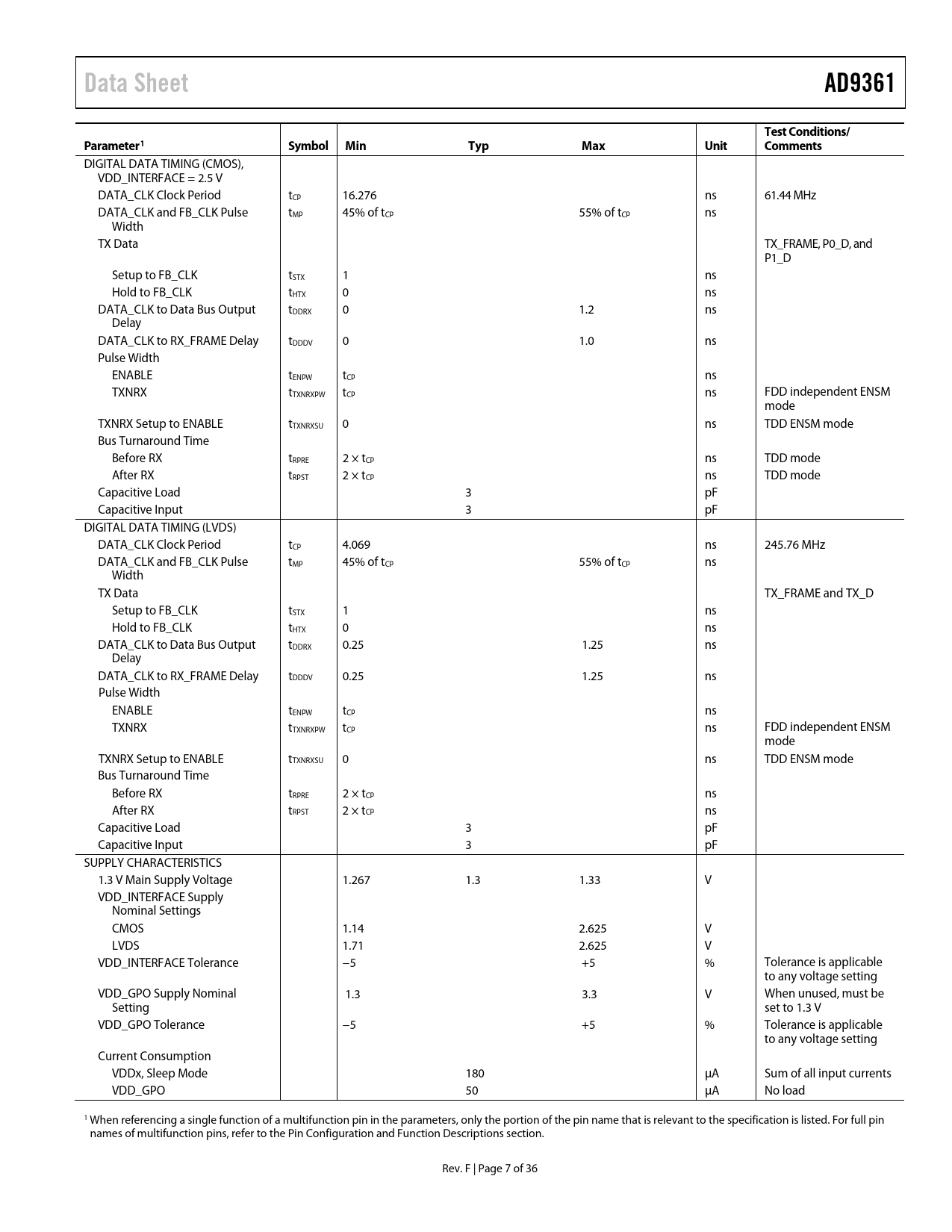 link to page 16 Data SheetAD9361Test Conditions/Parameter1Symbol MinTypMaxUnitComments DIGITAL DATA TIMING (CMOS), VDD_INTERFACE = 2.5 V DATA_CLK Clock Period tCP 16.276 ns 61.44 MHz DATA_CLK and FB_CLK Pulse tMP 45% of tCP 55% of tCP ns Width TX Data TX_FRAME, P0_D, and P1_D Setup to FB_CLK tSTX 1 ns Hold to FB_CLK tHTX 0 ns DATA_CLK to Data Bus Output tDDRX 0 1.2 ns Delay DATA_CLK to RX_FRAME Delay tDDDV 0 1.0 ns Pulse Width ENABLE tENPW tCP ns TXNRX tTXNRXPW tCP ns FDD independent ENSM mode TXNRX Setup to ENABLE tTXNRXSU 0 ns TDD ENSM mode Bus Turnaround Time Before RX tRPRE 2 × tCP ns TDD mode After RX tRPST 2 × tCP ns TDD mode Capacitive Load 3 pF Capacitive Input 3 pF DIGITAL DATA TIMING (LVDS) DATA_CLK Clock Period tCP 4.069 ns 245.76 MHz DATA_CLK and FB_CLK Pulse tMP 45% of tCP 55% of tCP ns Width TX Data TX_FRAME and TX_D Setup to FB_CLK tSTX 1 ns Hold to FB_CLK tHTX 0 ns DATA_CLK to Data Bus Output tDDRX 0.25 1.25 ns Delay DATA_CLK to RX_FRAME Delay tDDDV 0.25 1.25 ns Pulse Width ENABLE tENPW tCP ns TXNRX tTXNRXPW tCP ns FDD independent ENSM mode TXNRX Setup to ENABLE tTXNRXSU 0 ns TDD ENSM mode Bus Turnaround Time Before RX tRPRE 2 × tCP ns After RX tRPST 2 × tCP ns Capacitive Load 3 pF Capacitive Input 3 pF SUPPLY CHARACTERISTICS 1.3 V Main Supply Voltage 1.267 1.3 1.33 V VDD_INTERFACE Supply Nominal Settings CMOS 1.14 2.625 V LVDS 1.71 2.625 V VDD_INTERFACE Tolerance −5 +5 % Tolerance is applicable to any voltage setting VDD_GPO Supply Nominal 1.3 3.3 V When unused, must be Setting set to 1.3 V VDD_GPO Tolerance −5 +5 % Tolerance is applicable to any voltage setting Current Consumption VDDx, Sleep Mode 180 μA Sum of all input currents VDD_GPO 50 μA No load 1 When referencing a single function of a multifunction pin in the parameters, only the portion of the pin name that is relevant to the specification is listed. For full pin names of multifunction pins, refer to the Pin Configuration and Function Descriptions section. Rev. F | Page 7 of 36 Document Outline FEATURES APPLICATIONS FUNCTIONAL BLOCK DIAGRAM GENERAL DESCRIPTION TABLE OF CONTENTS REVISION HISTORY SPECIFICATIONS CURRENT CONSUMPTION—VDD_INTERFACE CURRENT CONSUMPTION—VDDD1P3_DIG AND VDDAx (COMBINATION OF ALL 1.3 V SUPPLIES) ABSOLUTE MAXIMUM RATINGS REFLOW PROFILE THERMAL RESISTANCE ESD CAUTION PIN CONFIGURATION AND FUNCTION DESCRIPTIONS TYPICAL PERFORMANCE CHARACTERISTICS 800 MHz FREQUENCY BAND 2.4 GHz FREQUENCY BAND 5.5 GHz FREQUENCY BAND THEORY OF OPERATION GENERAL RECEIVER TRANSMITTER CLOCK INPUT OPTIONS SYNTHESIZERS RF PLLs BB PLL DIGITAL DATA INTERFACE DATA_CLK Signal FB_CLK Signal RX_FRAME Signal ENABLE STATE MACHINE SPI Control Mode Pin Control Mode SPI INTERFACE CONTROL PINS Control Outputs (CTRL_OUT[7:0]) Control Inputs (CTRL_IN[3:0]) GPO PINS (GPO_3 TO GPO_0) AUXILIARY CONVERTERS AUXADC AUXDAC1 and AUXDAC2 POWERING THE AD9361 PACKAGING AND ORDERING INFORMATION OUTLINE DIMENSIONS ORDERING GUIDE