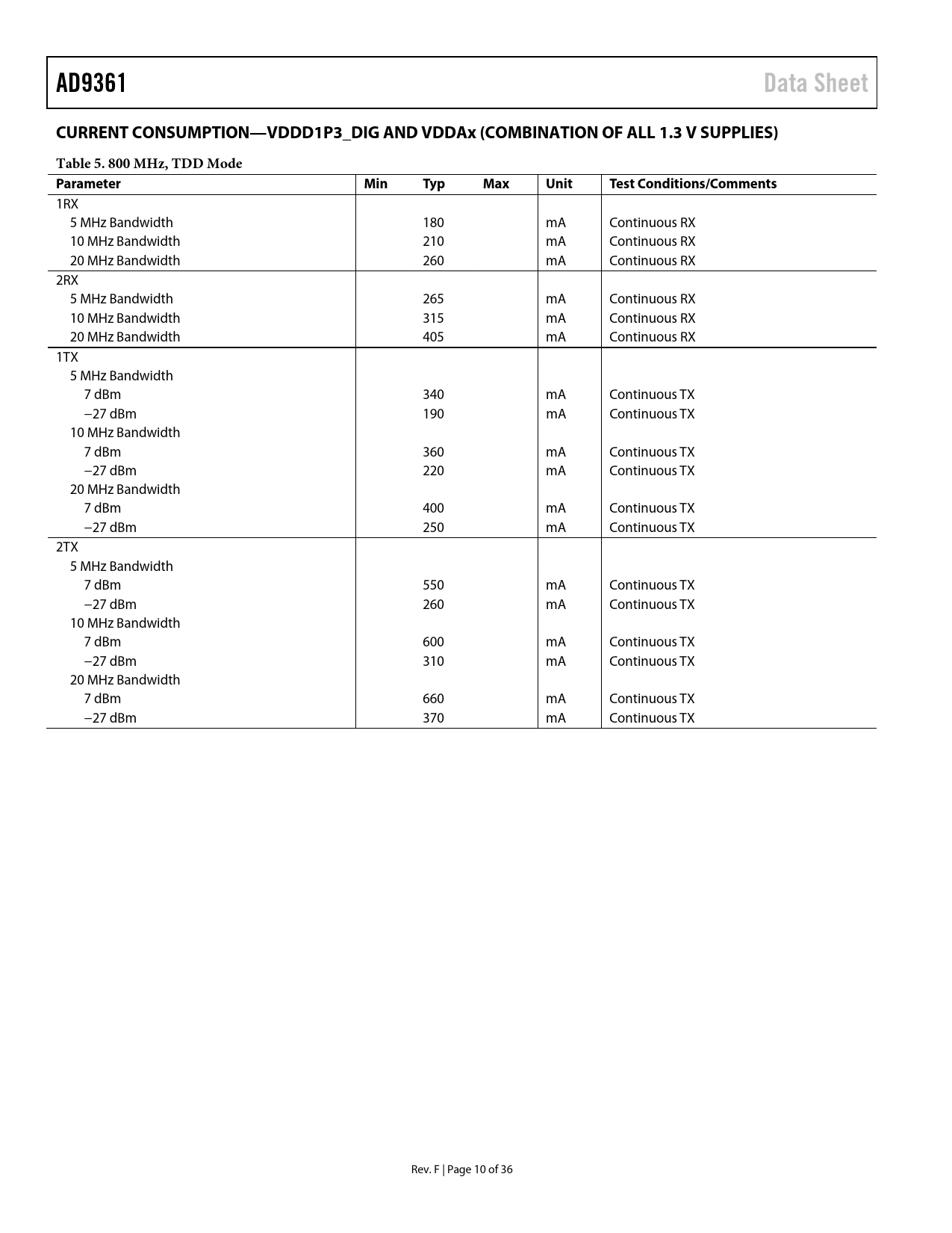 AD9361 Data Sheet CURRENT CONSUMPTION—VDDD1P3_DIG AND VDDAx (COMBINATION OF ALL 1.3 V SUPPLIES) Table 5. 800 MHz, TDD Mode Parameter Min Typ Max Unit Test Conditions/Comments