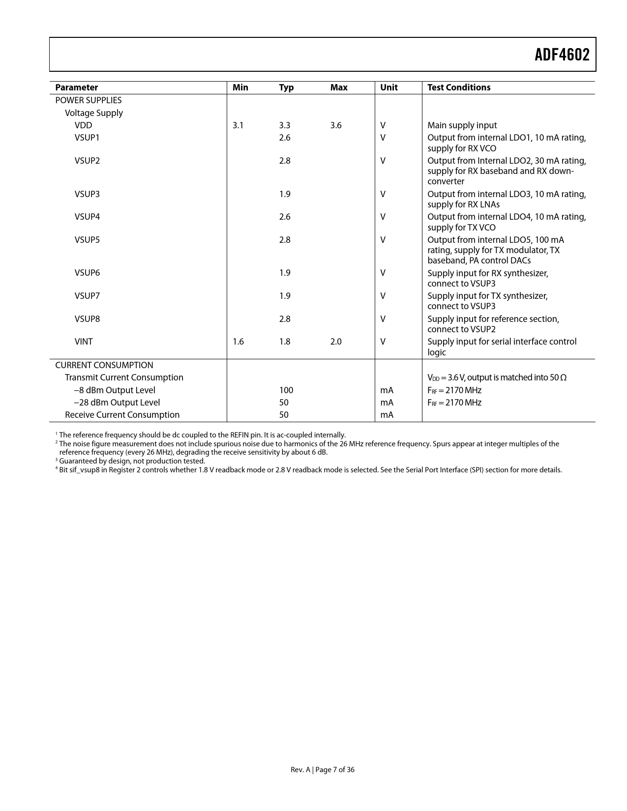 ADF4602ParameterMinTypMaxUnitTest Conditions POWER SUPPLIES Voltage Supply VDD 3.1 3.3 3.6 V Main supply input VSUP1 2.6 V Output from internal LDO1, 10 mA rating, supply for RX VCO VSUP2 2.8 V Output from Internal LDO2, 30 mA rating, supply for RX baseband and RX down- converter VSUP3 1.9 V Output from internal LDO3, 10 mA rating, supply for RX LNAs VSUP4 2.6 V Output from internal LDO4, 10 mA rating, supply for TX VCO VSUP5 2.8 V Output from internal LDO5, 100 mA rating, supply for TX modulator, TX baseband, PA control DACs VSUP6 1.9 V Supply input for RX synthesizer, connect to VSUP3 VSUP7 1.9 V Supply input for TX synthesizer, connect to VSUP3 VSUP8 2.8 V Supply input for reference section, connect to VSUP2 VINT 1.6 1.8 2.0 V Supply input for serial interface control logic CURRENT CONSUMPTION Transmit Current Consumption VDD = 3.6 V, output is matched into 50 Ω −8 dBm Output Level 100 mA FRF = 2170 MHz −28 dBm Output Level 50 mA FRF = 2170 MHz Receive Current Consumption 50 mA 1 The reference frequency should be dc coupled to the REFIN pin. It is ac-coupled internally. 2 The noise figure measurement does not include spurious noise due to harmonics of the 26 MHz reference frequency. Spurs appear at integer multiples of the reference frequency (every 26 MHz), degrading the receive sensitivity by about 6 dB. 3 Guaranteed by design, not production tested. 4 Bit sif_vsup8 in Register 2 controls whether 1.8 V readback mode or 2.8 V readback mode is selected. See the Serial Port Interface (S sect PI) ion for more details. Rev. A | Page 7 of 36 Document Outline FEATURES APPLICATIONS FUNCTIONAL BLOCK DIAGRAM TABLE OF CONTENTS REVISION HISTORY GENERAL DESCRIPTION SPECIFICATIONS TIMING CHARACTERISTICS ABSOLUTE MAXIMUM RATINGS ESD CAUTION PIN CONFIGURATION AND FUNCTION DESCRIPTIONS TYPICAL PERFORMANCE CHARACTERISTICS THEORY OF OPERATION TRANSMITTER DESCRIPTION I/Q Baseband I/Q Modulator VCO Output TX Output Baluns DACS GENERAL PURPOSE OUTPUTS RECEIVER DESCRIPTION LNAs Mixers Baseband Section Gain Control DC Offset Compensation POWER MANAGEMENT FREQUENCY SYNTHESIS Reference Path SERIAL PORT INTERFACE (SPI) Format OPERATION AND TIMING Read REGISTERS REGISTER MAP REGISTER DESCRIPTION SOFTWARE INITIALIZATION PROCEDURE INITIALIZATION SEQUENCE Nonvolatile Memory (NVM) Initialization Programming Transmit and Receive frequencies APPLICATIONS INFORMATION INTERFACING THE ADF4602 TO THE AD9963 AD9963 ADC Inputs Interfacing to the AD9963 Rx Baseband Inputs AD9963 DAC Outputs Reference Voltage Current Scaling Resistor, RSET Gain Scaling Parameters RECEIVE SENSITIVITY Interfacing to the AD9963 TX Baseband Outputs OUTLINE DIMENSIONS ORDERING GUIDE