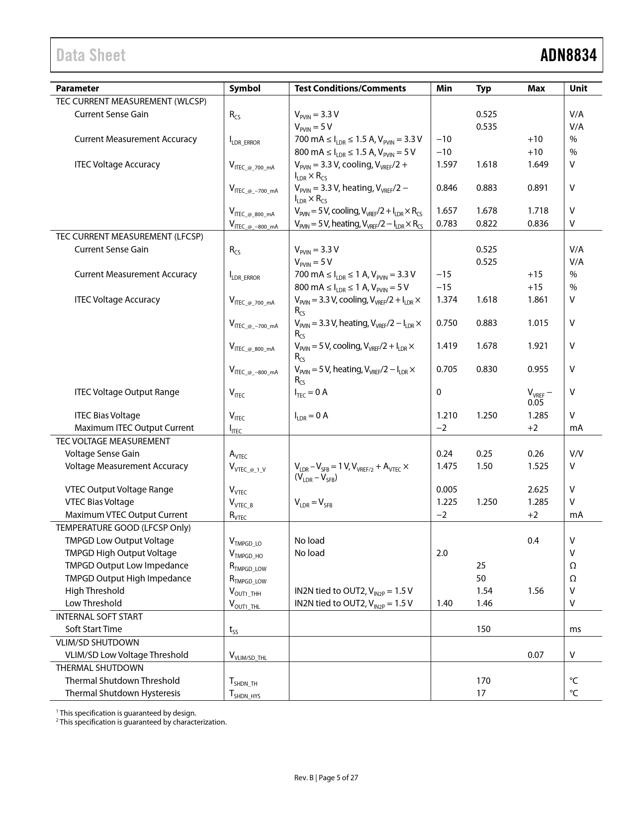 页数 / 页27 / 5 — Data Sheet. ADN8834. Parameter. Symbol. Test Conditions/Comments. Min. …