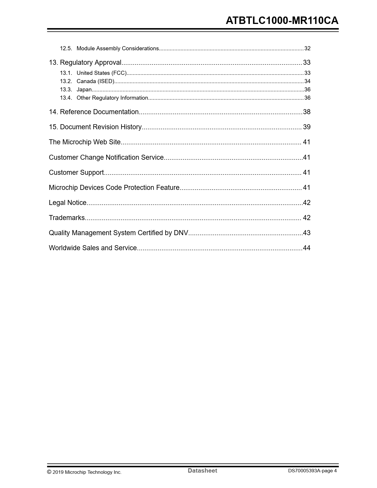 12.5. Module Assembly Considerations.. 32 13. Regulatory Approval.. 33 13.1. United States (FCC)... 33 13.2. Canada (ISED)... 34 13.3. Japan..36 13.4. Other Regulatory Information... 36 14. Reference Documentation...38 15. Document Revision History... 39 The Microchip Web Site.. 41 Customer Change Notification Service..41 Customer Support... 41 Microchip Devices Code Protection Feature... 41 Legal Notice...42 Trademarks... 42 Quality Management System Certified by DNV...43 Worldwide Sales and Service..44 © 2019 Microchip Technology Inc.