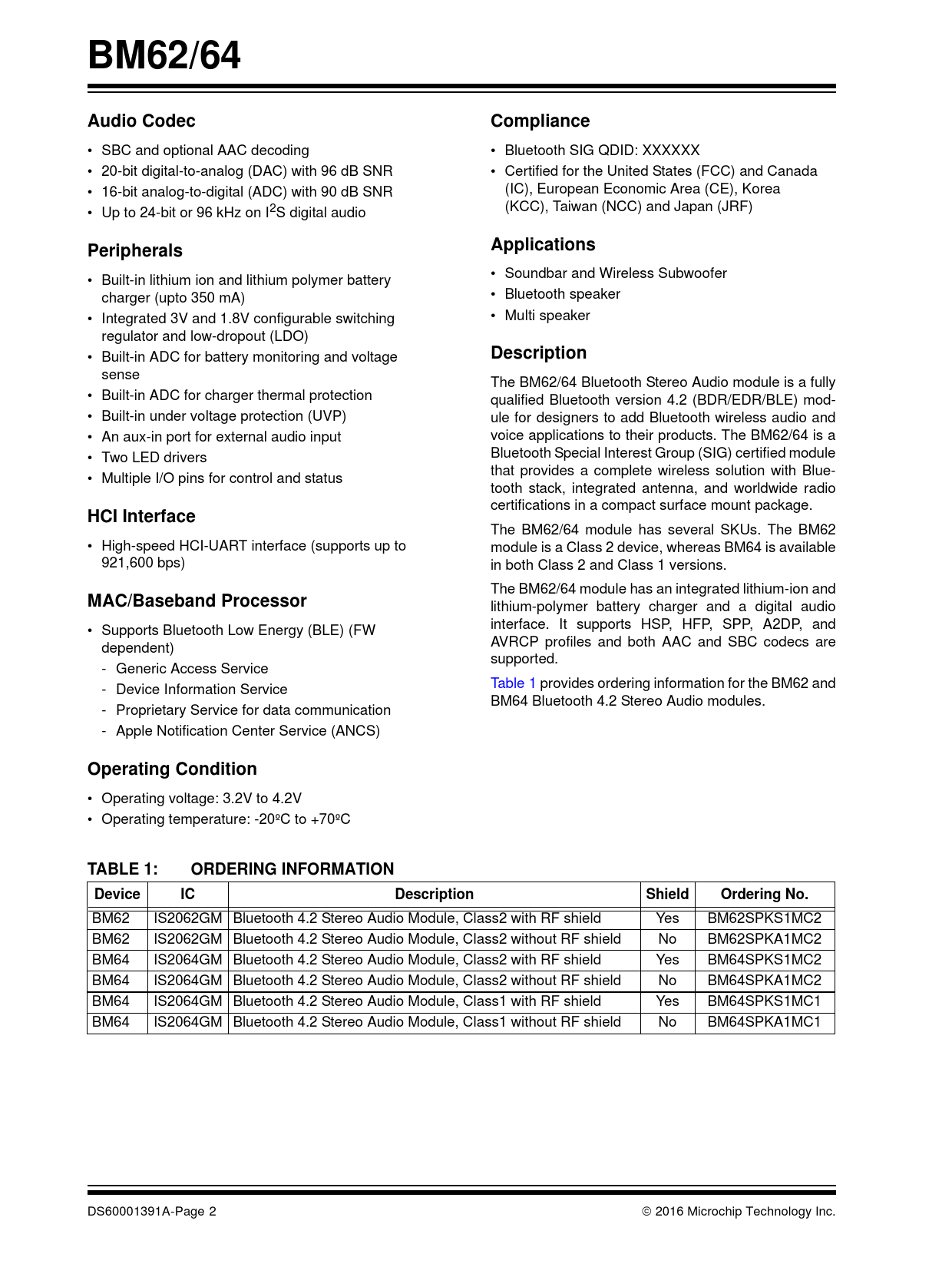 BM62 IS2062GM Bluetooth 4.2 Stereo Audio Module, Class2 with RF shield Yes BM62SPKS1MC2 BM62 IS2062GM Bluetooth 4.2 Stereo Audio Module, Class2 without RF shield No BM62SPKA1MC2 BM64 IS2064GM Bluetooth 4.2 Stereo Audio Module, Class2 with RF shield Yes BM64SPKS1MC2 BM64 IS2064GM Bluetooth 4.2 Stereo Audio Module, Class2 without RF shield No BM64SPKA1MC2 BM64 IS2064GM Bluetooth 4.2 Stereo Audio Module, Class1 with RF shield Yes BM64SPKS1MC1 BM64 IS2064GM Bluetooth 4.2 Stereo Audio Module, Class1 without RF shield No BM64SPKA1MC1 DS60001391A-Page 2  2016 Microchip Technology Inc. Document Outline Features RF/Analog DSP Audio Processing Audio Codec Peripherals HCI Interface MAC/Baseband Processor Operating Condition Compliance Applications Description