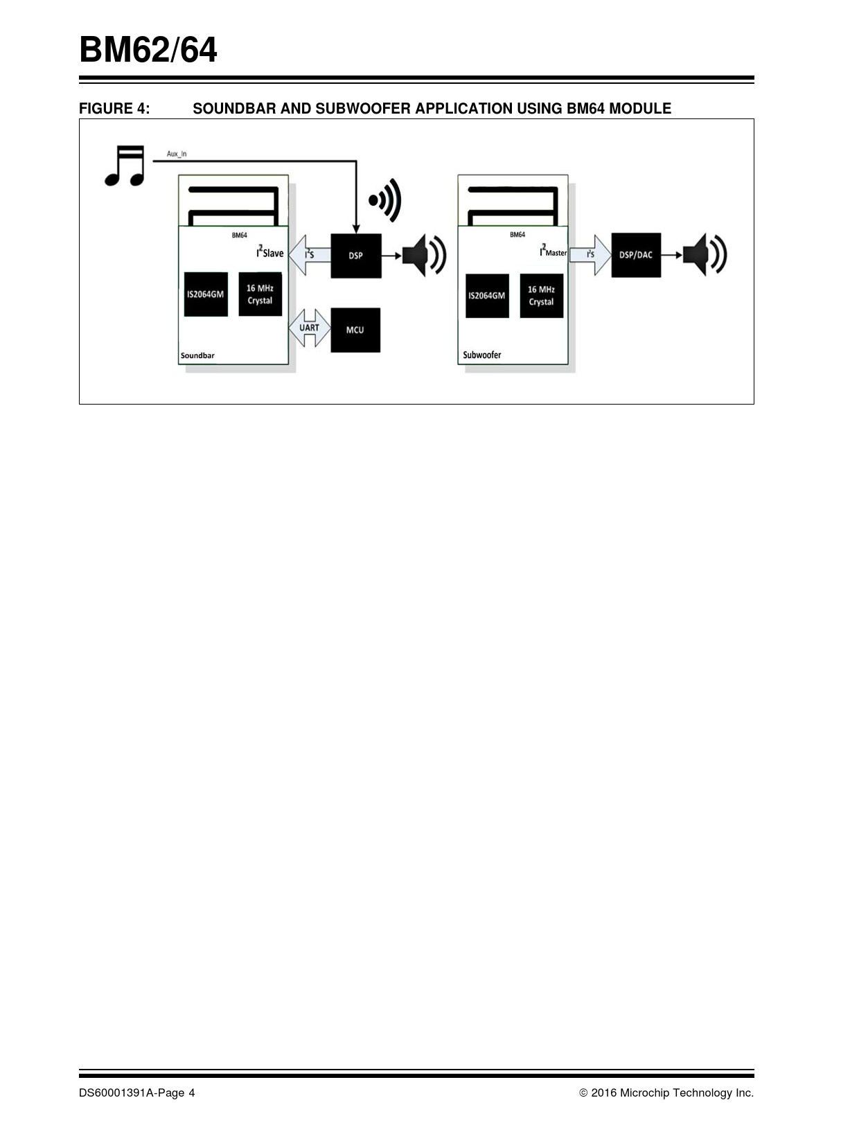 | 页数 / 页 | 8 / 4 — BM62/64. FIGURE 4:. SOUNDBAR AND SUBWOOFER APPLICATION USING BM64 MODULE |
