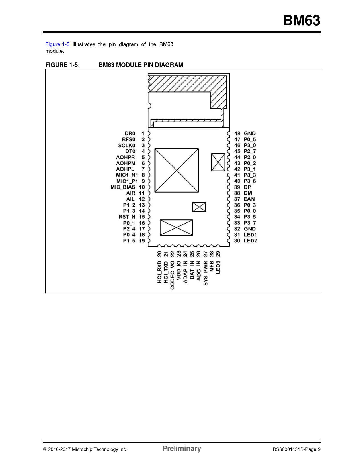 页数 / 页56 / 9 — BM63. FIGURE 1-5:. BM63 MODULE PIN DIAGRAM. Preliminary