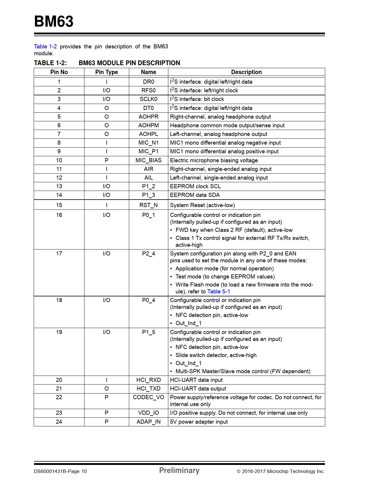 link to page 10 link to page 26 BM63 Table 1-2 provides the pin description of the BM63 module. TABLE 1-2:BM63 MODULE PIN DESCRIPTIONPin NoPin TypeNameDescription 1 I DR0 I2S interface: digital left/right data 2 I/O RFS0 I2S interface: left/right clock 3 I/O SCLK0 I2S interface: bit clock 4 O DT0 I2S interface: digital left/right data 5 O AOHPR Right-channel, analog headphone output 6 O AOHPM Headphone common mode output/sense input 7 O AOHPL Left-channel, analog headphone output 8 I MIC_N1 MIC1 mono differential analog negative input 9 I MIC_P1 MIC1 mono differential analog positive input 10 P MIC_BIAS Electric microphone biasing voltage 11 I AIR Right-channel, single-ended analog input 12 I AIL Left-channel, single-ended analog input 13 I/O P1_2 EEPROM clock SCL 14 I/O P1_3 EEPROM data SDA 15 I RST_N System Reset (active-low) 16 I/O P0_1 Configurable control or indication pin (Internally pulled-up if configured as an input) • FWD key when Class 2 RF (default), active-low • Class 1 Tx control signal for external RF Tx/Rx switch, active-high 17 I/O P2_4 System configuration pin along with P2_0 and EAN pins used to set the module in any one of these modes: • Application mode (for normal operation) • Test mode (to change EEPROM values) • Write Flash mode (to load a new firmware into the mod- ule), refer to Table 5-1 18 I/O P0_4 Configurable control or indication pin (Internally pulled-up if configured as an input) • NFC detection pin, active-low • Out_Ind_1 19 I/O P1_5 Configurable control or indication pin (Internally pulled-up if configured as an input) • NFC detection pin, active-low • Slide switch detector, active-high • Out_Ind_1 • Multi-SPK Master/Slave mode control (FW dependent) 20 I HCI_RXD HCI-UART data input 21 O HCI_TXD HCI-UART data output 22 P CODEC_VO Power supply/reference voltage for codec. Do not connect, for internal use only 23 P VDD_IO I/O positive supply. Do not connect, for internal use only 24 P ADAP_IN 5V power adapter input DS60001431B-Page 10 Preliminary 2016-2017 Microchip Technology Inc. Document Outline Features DSP Audio Processing FIGURE 1: BM63 MODULE Audio Codec Peripherals RF/Analog HCI Interface MAC/Baseband Processor Operating Condition Compliance Applications Description Table of Contents Most Current Data Sheet Errata Customer Notification System 1.0 Device Overview FIGURE 1-1: Application using BM63 Module FIGURE 1-2: Soundbar and subwoofer applications Using BM63 Module FIGURE 1-3: Soundbar and subwoofer Applications using BM63 MODULE AND smartphone FIGURE 1-4: Multi-speaker application using BM63 MODULE TABLE 1-1: BM63 KEY FEATURES FIGURE 1-5: BM63 Module PIN Diagram TABLE 1-2: BM63 module PIN Description 2.0 Audio 2.1 Digital Signal Processor FIGURE 2-1: Speech Signal Processing FIGURE 2-2: Audio Signal Processing 2.2 Codec FIGURE 2-3: CODEC DAC Dynamic Range FIGURE 2-4: CODEC DAC THD+N versus input power FIGURE 2-5: CODEC DAC FREQUENCY RESPONSE (CAPLESS MODE) FIGURE 2-6: CODEC DAC Frequency response (Single-EndED mode) 2.3 Auxiliary Port 2.4 Analog Speaker Output FIGURE 2-7: ANALOG SPEAKER OUTPUT CAPLESS MODE FIGURE 2-8: ANALOG SPEAKER OUTPUT SINGLE-ENDED MODE 3.0 Transceiver 3.1 Transmitter 3.2 Receiver 3.3 Synthesizer 3.4 Modem 3.5 Adaptive Frequency Hopping (AFH) 4.0 Power Management Unit 4.1 Charging a Battery FIGURE 4-1: BATTERY CHARGING CURVE 4.2 Voltage Monitoring 4.3 LED Driver FIGURE 4-2: LED DRIVER 4.4 Under Voltage Protection 5.0 Application Information 5.1 Host MCU Interface FIGURE 5-1: HOST MCU INTERFACE OVER UART FIGURE 5-2: Power-On/Off Sequence FIGURE 5-3: TIMING SEQUENCE OF RX INDICATION AFTER POWER-ON STATE FIGURE 5-4: TIMING SEQUENCE OF POWER-OFF STATE FIGURE 5-5: TIMING SEQUENCE OF POWER-ON (NACK) FIGURE 5-6: RESET TIMING SEQUENCE IN CASE OF NO RESPONSE FROM MODULE TO HOST MCU 5.2 I2S Mode Application FIGURE 5-7: BM63 MODULE IN I2S MASTER MODE FIGURE 5-8: BM63 MODULE IN I2S SLAVE MODE 5.3 Reset 5.4 External Configuration and Programming FIGURE 5-9: EXTERNAL PROGRAMMING HEADER CONNECTIONS TABLE 5-1: SYSTEM CONFIGURATION I/O PINSETTINGS 5.5 Reference Circuit FIGURE 5-10: BM63 REFERENCE CIRCUIT FOR STEREO HEADSET APPLICATIONS FIGURE 5-11: BM63 REFERENCE CIRCUIT FOR STEREO HEADSET APPLICATIONS FIGURE 5-12: BM63 REFERENCE CIRCUIT FOR STEREO HEADSET APPLICATIONS FIGURE 5-13: BM63 REFERENCE CIRCUIT FOR STEREO HEADSET APPLICATIONS FIGURE 5-14: BM63 REFERENCE CIRCUIT FOR STEREO HEADSET APPLICATIONS 6.0 Printed Antenna Information 6.1 Antenna Radiation Pattern FIGURE 6-1: RECOMMENDED KEEPOUT AREA FOR PCB ANTENNA FIGURE 6-2: PCB ANTENNA 3D RADIATION PATTERN at 2441 MHz TABLE 6-1: BM63 PCB ANTENNA CHARACTERISTICS 6.2 Module Placement Guidelines FIGURE 6-3: BM63 MODULE PLACEMENT GUIDELINES FIGURE 6-4: GND PLANE ON MAIN APPLICATION BOARD 7.0 Physical Dimensions FIGURE 7-1: BM63 module PCB DIMENSIONS FIGURE 7-2: RECOMMENDED BM63 module PCB FOOTPRINT 8.0 Electrical Characteristics 8.1 Absolute Maximum Ratings TABLE 8-1: RECOMMENDED OPERATING CONDITION TABLE 8-2: I/O AND RESET LEVEL TABLE 8-3: BATTERY CHARGER TABLE 8-4: LED DRIVER TABLE 8-5: AUDIO CODEC ANALOG TO DIGITAL CONVERTER TABLE 8-6: AUDIO CODEC DIGITAL TO ANALOG CONVERTER TABLE 8-7: TRANSMITTER SECTION FOR BDR AND EDR TABLE 8-8: RECEIVER SECTION FOR BDR AND EDR TABLE 8-9: BM63 SYSTEM CURRENT CONSUMPTION 8.2 Timing specifications FIGURE 8-1: TIMING DIAGRAM FOR I2S MODES (MASTER/SLAVE) FIGURE 8-2: TIMING DIAGRAM FOR PCM MODES (MASTER/SLAVE) FIGURE 8-3: AUDIO INTERFACE TIMING DIAGRAM TABLE 8-10: AUDIO INTERFACE TIMING Specifications 9.0 Soldering Recommendations FIGURE 9-1: REFLOW PROFILE 10.0 Ordering Information TABLE 10-1: BM63 Module ORDERING INFORMATION Appendix A: Revision History Revision A (June 2016) Revision B (January 2017) TABLE B-1: major Section Updates The Microchip Web Site Customer Change Notification Service Customer Support AMERICAS Corporate Office Atlanta Austin, TX Boston Chicago Dallas Detroit Houston, TX Indianapolis Los Angeles Raleigh, NC N