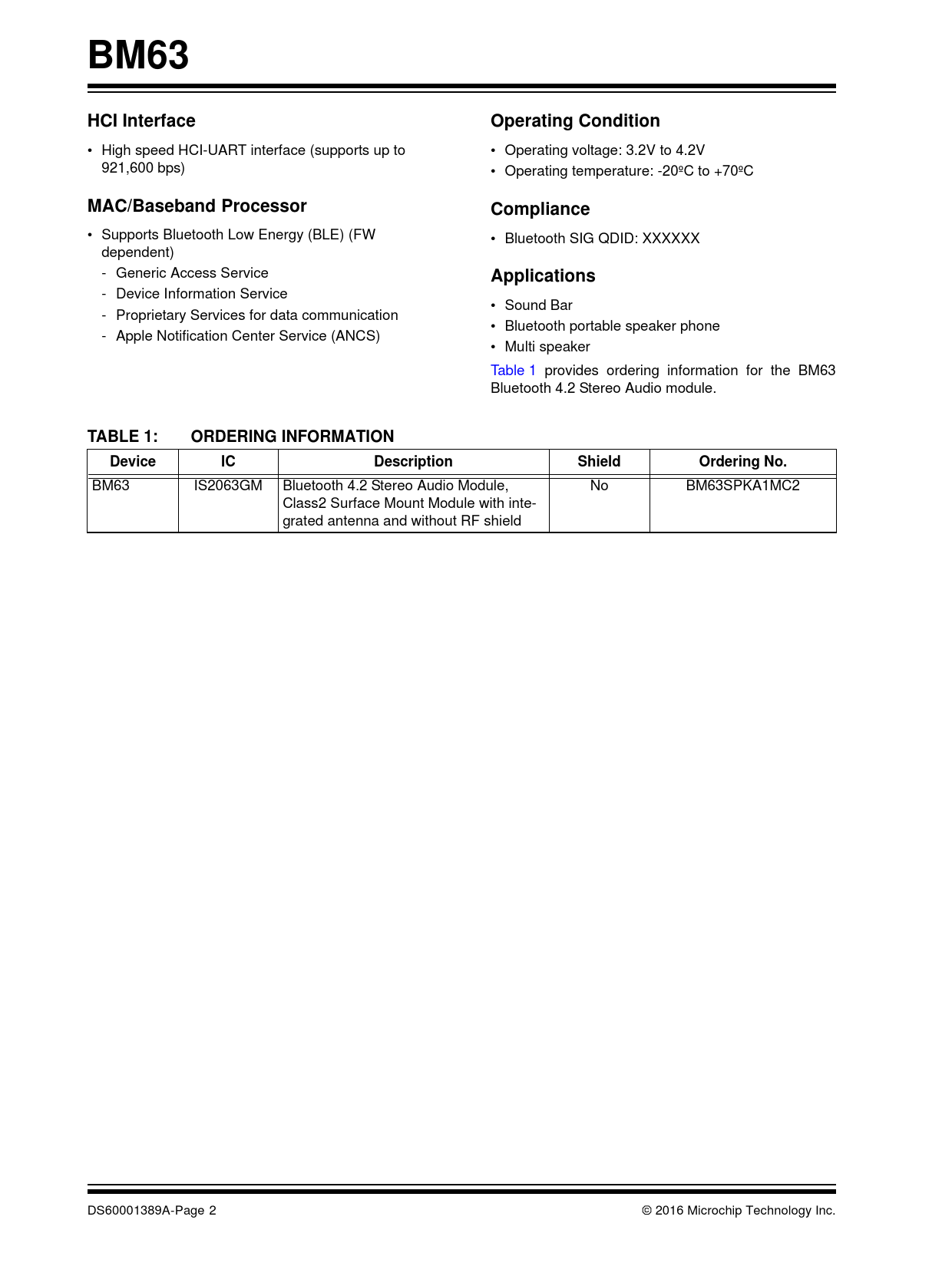 BM63. HCI Interface. Operating Condition. MAC/Baseband Processor. Compliance. Applications. TABLE 1:. ORDERING INFORMATION. Device IC