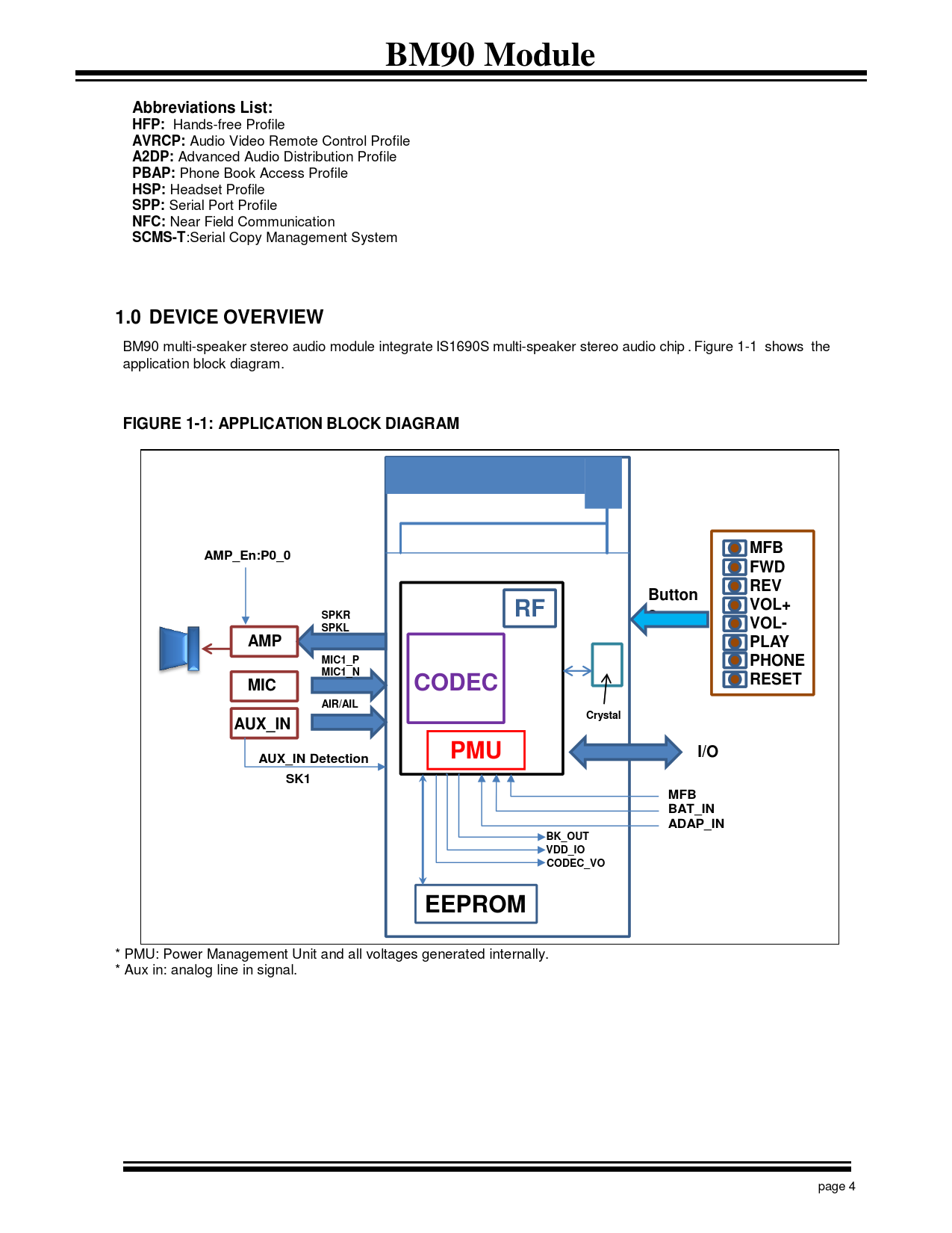BM90 Module. Abbreviations List: HFP:. AVRCP:. A2DP:. PBAP:. HSP:. SPP:. NFC:. SCMS-T. 1.0 DEVICE OVERVIEW