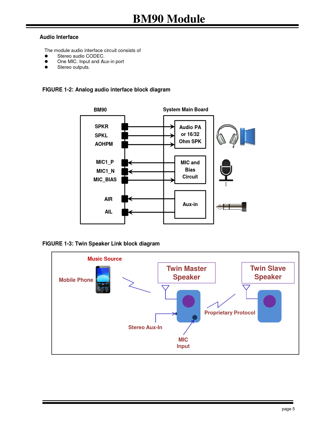 FIGURE 1-2: Analog audio interface block diagram BM90 System Main Board SPKR Audio PA or 16/32 SPKL Ohm SPK AOHPM MIC1_P MIC and Bias MIC1_N Circuit MIC_BIAS AIR Aux-in AIL FIGURE 1-3: Twin Speaker Link block diagram Music Source Twin Slave Twin Master Speaker Speaker Mobile Phone Proprietary Protocol Stereo Aux-In MIC Input