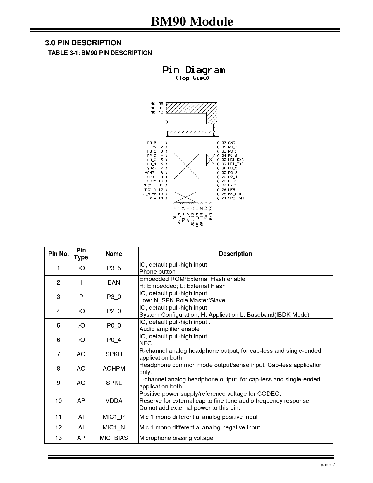 | 页数 / 页 | 31 / 7 — BM90 Module. 3.0 PIN DESCRIPTION. TABLE 3-1: BM90 PIN DESCRIPTION. Pin. … |