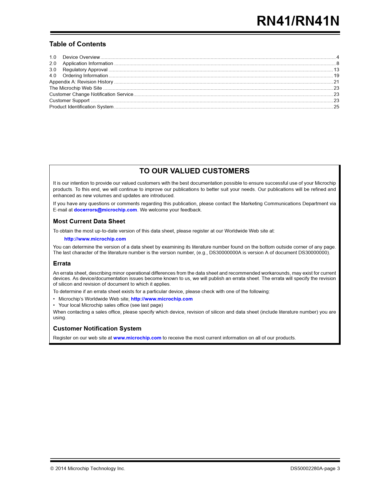 link to page 3 link to page 3 link to page 4 link to page 8 link to page 13 link to page 19 link to page 21 link to page 23 link to page 23 link to page 23 link to page 25 RN41/RN41NTable of Contents 1.0 Device Overview... 4 2.0 Application Information ... 8 3.0 Regulatory Approval ... 13 4.0 Ordering Information ... 19 Appendix A: Revision History ... 21 The Microchip Web Site ... 23 Customer Change Notification Service... 23 Customer Support .. 23 Product Identification System ... 25 TO OUR VALUED CUSTOMERS It is our intention to provide our valued customers with the best documentation possible to ensure successful use of your Microchip products. To this end, we will continue to improve our publications to better suit your needs. Our publications will be refined and enhanced as new volumes and updates are introduced. If you have any questions or comments regarding this publication, please contact the Marketing Communications Department via E-mail at docerrors@microchip.com . We welcome your feedback. Most Current Data Sheet To obtain the most up-to-date version of this data sheet, please register at our Worldwide Web site at: http://www.microchip.com You can determine the version of a data sheet by examining its literature number found on the bottom outside corner of any page. The last character of the literature number is the version number, (e.g., DS30000000A is version A of document DS30000000). Errata An errata sheet, describing minor operational differences from the data sheet and recommended workarounds, may exist for current devices. As device/documentation issues become known to us, we will publish an errata sheet. The errata will specify the revision of silicon and revision of document to which it applies. To determine if an errata sheet exists for a particular device, please check with one of the following: • Microchip’s Worldwide Web site; http://www.microchip.com • Your local Microchip sales office (see last page) When contacting a sales office, please specify which device, revision of silicon and data sheet (include literature number) you are using. Customer Notification System Register on our web site at www.microchip.com to receive the most current information on all of our products. 2014 Microchip Technology Inc. DS50002280A-page 3 Document Outline 1.0 Device Overview 1.1 MCU Interface 1.2 ASCII Command and Data Interface TABLE 1-1: Environmental Conditions TABLE 1-2: Electrical Characteristics TABLE 1-3: Module Dimensions TABLE 1-4: Radio Characteristics TABLE 1-5: Digital I/O Characteristics TABLE 1-6: Pin Description 2.0 Application Information 2.1 Reset Circuit 2.2 Factory Reset Using GPIO4 2.3 Connection Status TABLE 2-1: GPIO5 Status TABLE 2-2: GPIO2 Status 2.4 Module Mounting Details 2.5 External Antenna Types (RN41N) TABLE 2-3: Tested External Antenna Types 2.6 HCI Mode 2.7 Soldering Recommendations 2.8 SPI Interface 2.9 Bluetooth SIG QDID 2.10 Application Schematic 3.0 Regulatory Approval 3.1 United States 3.2 Canada 3.3 Europe TABLE 3-1: RN41 European Compliance Testing TABLE 3-2: RN41N European Compliance Testing 3.4 Australia 3.5 New Zealand 4.0 Ordering Information TABLE 4-1: Ordering Information Class 1 Bluetooth® Module with EDR Support Worldwide Sales and Service