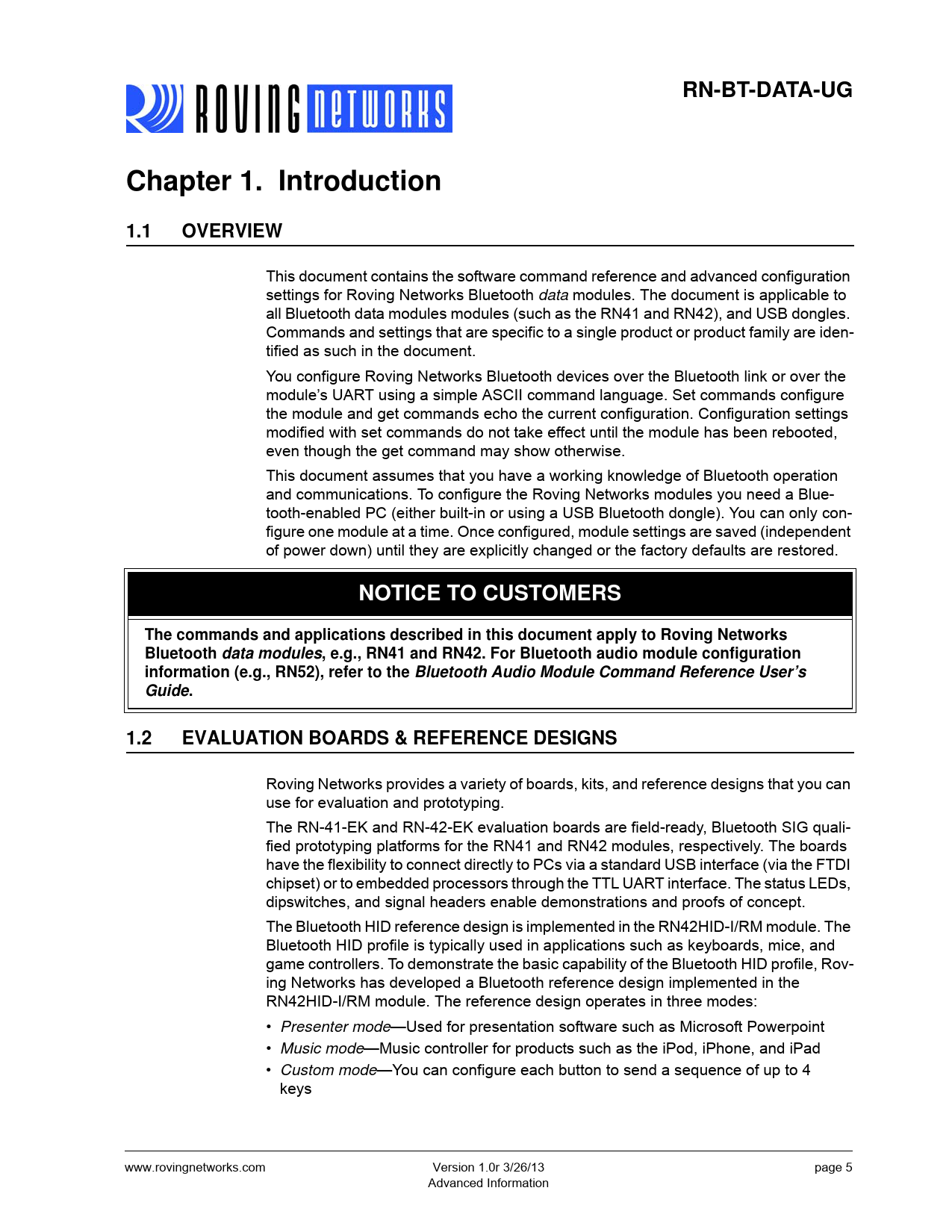 RN-BT-DATA-UGChapter 1. Introduction1.1OVERVIEW This document contains the software command reference and advanced configuration settings for Roving Networks Bluetooth data modules. The document is applicable to all Bluetooth data modules modules (such as the RN41 and RN42), and USB dongles. Commands and settings that are specific to a single product or product family are iden- tified as such in the document. You configure Roving Networks Bluetooth devices over the Bluetooth link or over the module’s UART using a simple ASCII command language. Set commands configure the module and get commands echo the current configuration. Configuration settings modified with set commands do not take effect until the module has been rebooted, even though the get command may show otherwise. This document assumes that you have a working knowledge of Bluetooth operation and communications. To configure the Roving Networks modules you need a Blue- tooth-enabled PC (either built-in or using a USB Bluetooth dongle). You can only con- figure one module at a time. Once configured, module settings are saved (independent of power down) until they are explicitly changed or the factory defaults are restored. NOTICE TO CUSTOMERSThe commands and applications described in this document apply to Roving Networks Bluetooth data modules, e.g., RN41 and RN42. For Bluetooth audio module configuration information (e.g., RN52), refer to the Bluetooth Audio Module Command Reference User’s Guide.1.2EVALUATION BOARDS & REFERENCE DESIGNS Roving Networks provides a variety of boards, kits, and reference designs that you can use for evaluation and prototyping. The RN-41-EK and RN-42-EK evaluation boards are field-ready, Bluetooth SIG quali- fied prototyping platforms for the RN41 and RN42 modules, respectively. The boards have the flexibility to connect directly to PCs via a standard USB interface (via the FTDI chipset) or to embedded processors through the TTL UART interface. The status LEDs, dipswitches, and signal headers enable demonstrations and proofs of concept. The Bluetooth HID reference design is implemented in the RN42HID-I/RM module. The Bluetooth HID profile is typically used in applications such as keyboards, mice, and game controllers. To demonstrate the basic capability of the Bluetooth HID profile, Rov- ing Networks has developed a Bluetooth reference design implemented in the RN42HID-I/RM module. The reference design operates in three modes: • Presenter mode—Used for presentation software such as Microsoft Powerpoint • Music mode—Music controller for products such as the iPod, iPhone, and iPad • Custom mode—You can configure each button to send a sequence of up to 4 keys www.rovingnetworks.com Version 1.0r 3/26/13 page 5 Advanced Information Document Outline Chapter 1. Introduction 1.1 Overview 1.2 Evaluation Boards & Reference Designs 1.3 Command Mode vs. Data Mode Figure 1-1: Data & Command Modes 1.3.1 Configuring the Module over the UART Port 1.3.2 Remote Configuration Using Bluetooth 1.3.3 Enter Command Mode Table 1-1: Serial Port Settings Figure 1-2: View Current Settings 1.4 Operating Modes 1.5 Using Dipswitches & GPIO Pins for Configuration Table 1-2: Dipswitch & GPIO Settings Table 1-3: GPIO Assignments 1.6 Making a Bluetooth Connection 1.6.1 Discovery Figure 1-3: Discover the Bluetooth Module 1.6.2 Pairing Figure 1-4: Pair with the Bluetooth Module Figure 1-5: Bluetooth COM Port Settings 1.6.2.1 Pairing with a Computer or Smart Phone 1.6.3 Connecting Figure 1-6: PC’s Bluetooth Radio MAC Address Figure 1-7: Terminals A & B 1.6.4 Security Modes Chapter 2. Command Reference 2.1 Command Syntax Table 2-1: Command Types 2.2 SET Commands 2.2.1 S7,<flag> Table 2-2: 7-Bit Data Mode Values 2.2.2 SA,<value> Table 2-3: Set Authentication Values 2.2.3 SB,<value> Table 2-4: Set Break Values 2.2.4 SC,<value> 2.2.5 SD,<value> 2.2.6 SE,<value> 2.2.6.1 Firmware version 5.40 & Higher 2.2.6.2 Firmware Prior to Version 5.40 Table 2-5: Set Encryption Enable 2.2.7 SF,1 2.2.8 SH,<value> Table 2-6: HID Flag Register Bits 2.2.9 SI,<hex value> 2.2.10 SJ,<hex value> 2.2.11 SL,<char> Table 2-7: UART Parity Values 2.2.12 SM,<value> Table 2-8: Mode Values 2.2.13 SN,<string> 2.2.14 SO,<string> 2.2.15 SP,<string> 2.2.16 SQ,<mask> Table 2-9: Special Configuration Settings Values 2.2.17 SR,<hex value> 2.2.18 SS,<string> 2.2.19 ST,<value> Table 2-10: Configuraion Timer Settings 2.2.20 SU,<value> 2.2.21 SW,<value> 2.2.22 SX,<flag> Table 2-11: Bonding Values 2.2.23 SY,<hex value> Table 2-12: Power Settings (August 2012 and Later) Table 2-13: Power table (before August 2012) 2.2.24 SZ,<value> 2.2.25 S~,<value> Table 2-14: Profile Values 2.2.26 S-,<string> 2.2.27 S?,<flag> Table 2-15: Role Switch Values 2.2.28 S$,<char> 2.2.29 S|,<value> 2.3 GET Commands 2.3.1 D 2.3.2 E 2.3.3 GB 2.3.4 GF 2.3.5 GK 2.3.6 GR 2.3.7 G& 2.3.8 G<char> 2.4 Change & Action Commands 2.4.1 $$$ 2.4.2 --- 2.4.3 + 2.4.4 & 2.4.5 C 2.4.6 C,<address> 2.4.7 CF,<address> 2.4.8 CFI 2.4.9 CFR 2.4.10 CT,<address>,<value> 2.4.11 F,1 2.4.12 H 2.4.13 I,<value 1>,<value 2> 2.4.14 IN<value 1>,< value 2> 2.4.15 IQ 2.4.16 IS<value> 2.4.17 IR<value> 2.4.18 J 2.4.19 K, 2.4.20 L 2.4.21 M 2.4.22 O 2.4.23 P,<char> 2.4.24 Q 2.4.25 R,1 2.4.26 T,<flag> Table 2-16: T Command Values 2.4.27 U,<value 1>,<value 2> 2.4.28 V 2.4.29 W 2.4.30 Z 2.5 GPIO Commands 2.5.1 S@,<hex value> 2.5.2 S&,<hex value> 2.5.3 S%,<hex value> 2.5.4 S^,<hex value> 2.5.5 S*,<hex value> 2.5.6 Controlling the GPIO Pins 2.5.7 Setting GPIO Pin Power-Up Values 2.5.8 Setting GPIO8, GPIO9, GPIO10 & GPIO11 Chapter 3. Advanced Topics 3.1 Power Management Table 3-1: Power Management Methods 3.1.1 Optimizing Inquiry (Discovery) & Page (Connection) Windows 3.1.2 Sniff Mode 3.1.3 Enabling Deep Sleep 3.1.4 Disabling Output Drivers 3.1.5 Lowering Transmit Power Table 3-2: Power Settings 3.2 Configuration Timer Settings Table 3-3: Configuration Timer Settings 3.3 Interfacing to a Microprocessor 3.3.0.1 How do I know the mod