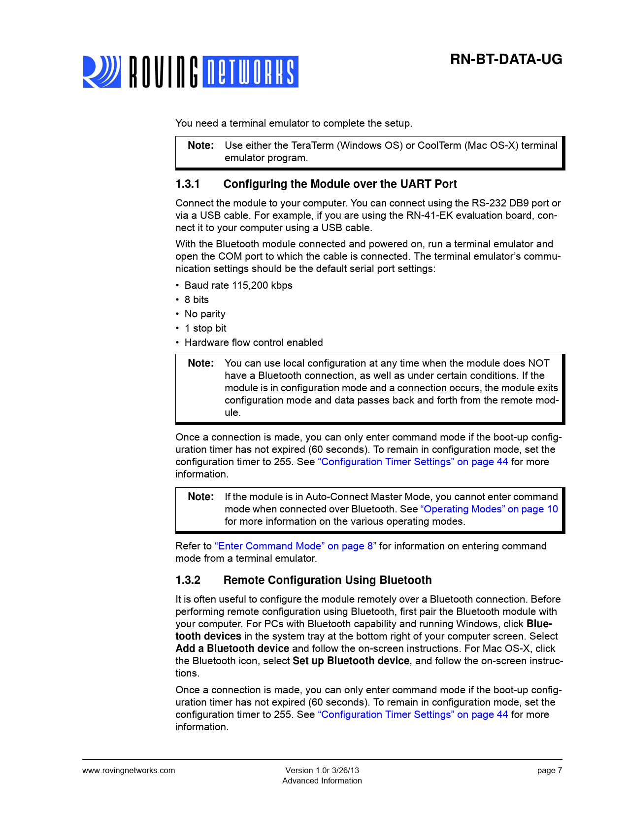 RN-BT-DATA-UG. Note:. 1.3.1. Configuring the Module over the UART Port. 1.3.2. Remote Configuration Using Bluetooth