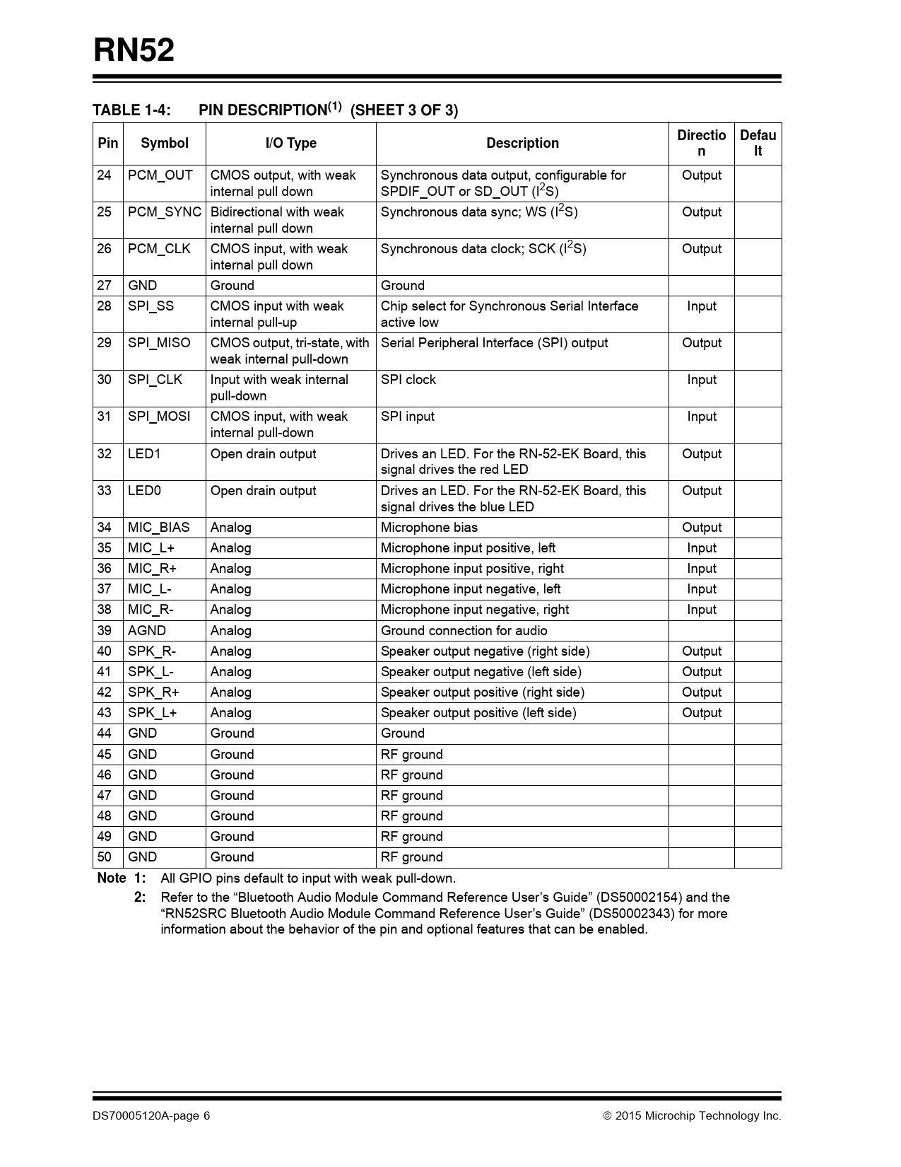 RN52. TABLE 1-4:. PIN DESCRIPTION(1) (SHEET 3 OF 3). Directio. Defau. Pin. Symbol. I/O Type. Description. Note 1:
