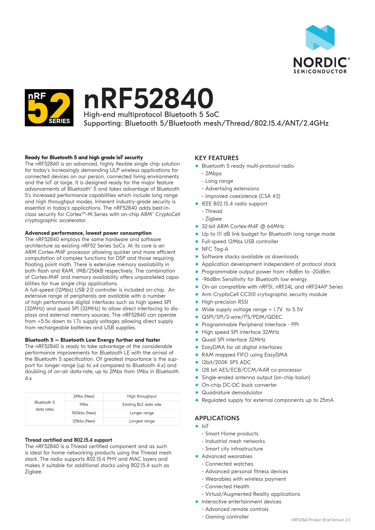 nRF52840 High-end multiprotocol Bluetooth 5 SoC Supporting: Bluetooth 5/Bluetooth mesh/Thread/802.15.4/ANT/2.4GHz