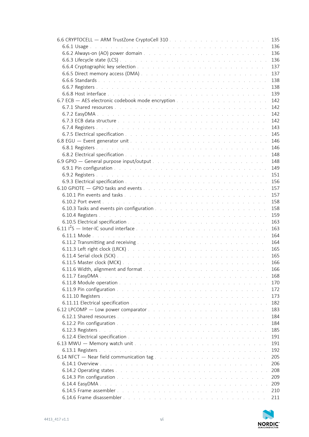 该数据表的模型线 文件文字版本 link to page 135 link to page 136 link to page 136 link to page 136 link to page 137 link to page 137 link to page 138 link to page 138 link to page 139 link to page 142 link to page 142 link to page 142 link to page 142 link to page 143 link to page 145 link to page 146 link to page 146 link to page 148 link to page 148 link to page 149 link to page 151 link to page 156 link to page 157 link to page 157 link to page 158 link to page 158 link to page 159 link to page 163 link to page 163 link to page 164 link to page 164 link to page 165 link to page 165 link to page 166 link to page 166 link to page 168 link to page 170 link to page 172 link to page 173 link to page 182 link to page 183 link to page 184 link to page 184 link to page 185 link to page 191 link to page 191 link to page 192 link to page 205 link to page 206 link to page 208 link to page 209 link to page 209 link to page 210 link to page 211 6.6 CRYPTOCELL — ARM TrustZone CryptoCell 310 . 135 6.6.1 Usage . 136 6.6.2 Always-on (AO) power domain . 136 6.6.3 Lifecycle state (LCS) . 136 6.6.4 Cryptographic key selection . 137 6.6.5 Direct memory access (DMA) . 137 6.6.6 Standards . 138 6.6.7 Registers . 138 6.6.8 Host interface . 139 6.7 ECB — AES electronic codebook mode encryption . 142 6.7.1 Shared resources . 142 6.7.2 EasyDMA . 142 6.7.3 ECB data structure . 142 6.7.4 Registers . 143 6.7.5 Electrical specification . 145 6.8 EGU — Event generator unit . 146 6.8.1 Registers . 146 6.8.2 Electrical specification . 148 6.9 GPIO — General purpose input/output . 148 6.9.1 Pin configuration . 149 6.9.2 Registers . 151 6.9.3 Electrical specification . 156 6.10 GPIOTE — GPIO tasks and events . 157 6.10.1 Pin events and tasks . 157 6.10.2 Port event . 158 6.10.3 Tasks and events pin configuration . 158 6.10.4 Registers . 159 6.10.5 Electrical specification . 163 6.11 I2S — Inter-IC sound interface . 163 6.11.1 Mode . 164 6.11.2 Transmitting and receiving . 164 6.11.3 Left right clock (LRCK) . 165 6.11.4 Serial clock (SCK) . 165 6.11.5 Master clock (MCK) . 166 6.11.6 Width, alignment and format . 166 6.11.7 EasyDMA . 168 6.11.8 Module operation . 170 6.11.9 Pin configuration . 172 6.11.10 Registers . 173 6.11.11 Electrical specification . 182 6.12 LPCOMP — Low power comparator . 183 6.12.1 Shared resources . 184 6.12.2 Pin configuration . 184 6.12.3 Registers . 185 6.12.4 Electrical specification . 191 6.13 MWU — Memory watch unit . 191 6.13.1 Registers . 192 6.14 NFCT — Near field communication tag . 205 6.14.1 Overview . 206 6.14.2 Operating states . 208 6.14.3 Pin configuration . 209 6.14.4 EasyDMA . 209 6.14.5 Frame assembler . 210 6.14.6 Frame disassembler . 211 4413_417 v1.1 vi Document Outline Contents Feature list Revision history About this document 2.1 Document naming and status 2.2 Peripheral naming and abbreviations 2.3 Register tables 2.3.1 Fields and values 2.4 Registers 2.4.1 DUMMY Block diagram Core components 4.1 CPU 4.1.1 Floating point interrupt 4.1.2 CPU and support module configuration 4.1.3 Electrical specification 4.1.3.1 CPU performance 4.2 Memory 4.2.1 RAM - Random access memory 4.2.2 Flash - Non-volatile memory 4.2.3 Memory map 4.2.4 Instantiation 4.3 NVMC — Non-volatile memory controller 4.3.1 Writing to flash 4.3.2 Erasing a page in flash 4.3.3 Writing to user information configuration registers (UICR) 4.3.4 Erasing user information configuration registers (UICR) 4.3.5 Erase all 4.3.6 Access port protection behavior 4.3.7 Partial erase of a page in flash 4.3.8 Cache 4.3.9 Registers 4.3.9.1 READY 4.3.9.2 READYNEXT 4.3.9.3 CONFIG 4.3.9.4 ERASEPAGE 4.3.9.5 ERASEPCR1 ( Deprecated ) 4.3.9.6 ERASEALL 4.3.9.7 ERASEPCR0 ( Deprecated ) 4.3.9.8 ERASEUICR 4.3.9.9 ERASEPAGEPARTIAL 4.3.9.10 ERASEPAGEPARTIALCFG 4.3.9.11 ICACHECNF 4.3.9.12 IHIT 4.3.9.13 IMISS 4.3.10 Electrical specification 4.3.10.1 Flash programming 4.3.10.2 Cache size 4.4 FICR — Factory information configuration registers 4.4.1 Registers 4.4.1.1 CODEPAGESIZE 4.4.1.2 CODESIZE 4.4.1.3 DEVICEID[n] (n=0..1) 4.4.1.4 ER[n] (n=0..3) 4.4.1.5 IR[n] (n=0..3) 4.4.1.6 DEVICEADDRTYPE 4.4.1.7 DEVICEADDR[n] (n=0..1) 4.4.1.8 INFO.PART 4.4.1.9 INFO.VARIANT 4.4.1.10 INFO.PACKAGE 4.4.1.11 INFO.RAM 4.4.1.12 INFO.FLASH 4.4.1.13 PRODTEST[n] (n=0..2) 4.4.1.14 TEMP.A0 4.4.1.15 TEMP.A1 4.4.1.16 TEMP.A2 4.4.1.17 TEMP.A3 4.4.1.18 TEMP.A4 4.4.1.19 TEMP.A5 4.4.1.20 TEMP.B0 4.4.1.21 TEMP.B1 4.4.1.22 TEMP.B2 4.4.1.23 TEMP.B3 4.4.1.24 TEMP.B4 4.4.1.25 TEMP.B5 4.4.1.26 TEMP.T0 4.4.1.27 TEMP.T1 4.4.1.28 TEMP.T2 4.4.1.29 TEMP.T3 4.4.1.30 TEMP.T4 4.4.1.31 NFC.TAGHEADER0 4.4.1.32 NFC.TAGHEADER1 4.4.1.33 NFC.TAGHEADER2 4.4.1.34 NFC.TAGHEADER3 4.4.1.35 TRNG90B.BYTES 4.4.1.36 TRNG90B.RCCUTOFF 4.4.1.37 TRNG90B.APCUTOFF 4.4.1.38 TRNG90B.STARTUP 4.4.1.39 TRNG90B.ROSC1 4.4.1.40 TRNG90B.ROSC2 4.4.1.41 TRNG90B.ROSC3 4.4.1.42 TRNG90B.ROSC4 4.5 UICR — User information configuration registers 4.5.1 Registers 4.5.1.1 NRFFW[n] (n=0..12) 4.5.1.2 NRFHW[n] (n=0..11) 4.5.1.3 CUSTOMER[n] (n=0..31) 4.5.1.4 PSELRESET[n] (n=0..1) 4.5.1.5 APPROTECT 4.5.1.6 NFCPINS 4.5.1.7 DEBUGCTRL 4.5.1.8 REGOUT0 4.6 EasyDMA 4.6.1 EasyDMA error handling 4.6.2 EasyDMA array list 4.7 AHB multilayer 4.8 Debug and trace 4.8.1 DAP - Debug access port 4.8.2 CTRL-AP - Control access port 4.8.2.1 Registers 4.8.2.1.1 RESET 4.8.2.1.2 ERASEALL 4.8.2.1.3 ERASEALLSTATUS 4.8.2.1.4 APPROTECTSTATUS 4.8.2.1.5 IDR 4.8.2.2 Electrical specification 4.8.2.2.1 Control access port 4.8.3 Debug interface mode 4.8.4 Real-time debug 4.8.5 Trace 4.8.5.1 Electrical specification 4.8.5.1.1 Trace port Power and clock management 5.1 Power management unit (PMU) 5.2 Current consumption 5.2.1 Electrical specification 5.2.1.1 Sleep 5.2.1.2 COMP active 5.2.1.3 CPU running 5.2.1.4 NFCT active 5.2.1.5 Radio transmitting/receiving 5.2.1.6 RNG active 5.2.1.7 SAADC active 5.2.1.8 TEMP active 5.2.1.9 TIMER running 5.2.1.10 WDT active 5.2.1.11 Compounded 5.3 POWER — Power supply 5.3.1 Main supply 5.3.1.