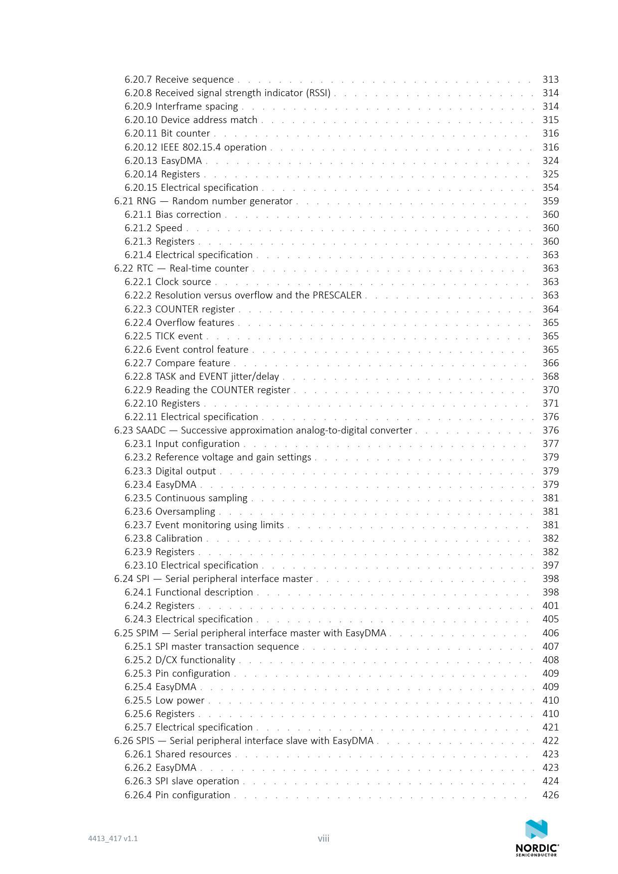 该数据表的模型线 文件文字版本 link to page 313 link to page 314 link to page 314 link to page 315 link to page 316 link to page 316 link to page 324 link to page 325 link to page 354 link to page 359 link to page 360 link to page 360 link to page 360 link to page 363 link to page 363 link to page 363 link to page 363 link to page 364 link to page 365 link to page 365 link to page 365 link to page 366 link to page 368 link to page 370 link to page 371 link to page 376 link to page 376 link to page 377 link to page 379 link to page 379 link to page 379 link to page 381 link to page 381 link to page 381 link to page 382 link to page 382 link to page 397 link to page 398 link to page 398 link to page 401 link to page 405 link to page 406 link to page 407 link to page 408 link to page 409 link to page 409 link to page 410 link to page 410 link to page 421 link to page 422 link to page 423 link to page 423 link to page 424 link to page 426 6.20.7 Receive sequence . 313 6.20.8 Received signal strength indicator (RSSI) . 314 6.20.9 Interframe spacing . 314 6.20.10 Device address match . 315 6.20.11 Bit counter . 316 6.20.12 IEEE 802.15.4 operation . 316 6.20.13 EasyDMA . 324 6.20.14 Registers . 325 6.20.15 Electrical specification . 354 6.21 RNG — Random number generator . 359 6.21.1 Bias correction . 360 6.21.2 Speed . 360 6.21.3 Registers . 360 6.21.4 Electrical specification . 363 6.22 RTC — Real-time counter . 363 6.22.1 Clock source . 363 6.22.2 Resolution versus overflow and the PRESCALER . 363 6.22.3 COUNTER register . 364 6.22.4 Overflow features . 365 6.22.5 TICK event . 365 6.22.6 Event control feature . 365 6.22.7 Compare feature . 366 6.22.8 TASK and EVENT jitter/delay . 368 6.22.9 Reading the COUNTER register . 370 6.22.10 Registers . 371 6.22.11 Electrical specification . 376 6.23 SAADC — Successive approximation analog-to-digital converter . 376 6.23.1 Input configuration . 377 6.23.2 Reference voltage and gain settings . 379 6.23.3 Digital output . 379 6.23.4 EasyDMA . 379 6.23.5 Continuous sampling . 381 6.23.6 Oversampling . 381 6.23.7 Event monitoring using limits . 381 6.23.8 Calibration . 382 6.23.9 Registers . 382 6.23.10 Electrical specification . 397 6.24 SPI — Serial peripheral interface master . 398 6.24.1 Functional description . 398 6.24.2 Registers . 401 6.24.3 Electrical specification . 405 6.25 SPIM — Serial peripheral interface master with EasyDMA . 406 6.25.1 SPI master transaction sequence . 407 6.25.2 D/CX functionality . 408 6.25.3 Pin configuration . 409 6.25.4 EasyDMA . 409 6.25.5 Low power . 410 6.25.6 Registers . 410 6.25.7 Electrical specification . 421 6.26 SPIS — Serial peripheral interface slave with EasyDMA . 422 6.26.1 Shared resources . 423 6.26.2 EasyDMA . 423 6.26.3 SPI slave operation . 424 6.26.4 Pin configuration . 426 4413_417 v1.1 viii Document Outline Contents Feature list Revision history About this document 2.1 Document naming and status 2.2 Peripheral naming and abbreviations 2.3 Register tables 2.3.1 Fields and values 2.4 Registers 2.4.1 DUMMY Block diagram Core components 4.1 CPU 4.1.1 Floating point interrupt 4.1.2 CPU and support module configuration 4.1.3 Electrical specification 4.1.3.1 CPU performance 4.2 Memory 4.2.1 RAM - Random access memory 4.2.2 Flash - Non-volatile memory 4.2.3 Memory map 4.2.4 Instantiation 4.3 NVMC — Non-volatile memory controller 4.3.1 Writing to flash 4.3.2 Erasing a page in flash 4.3.3 Writing to user information configuration registers (UICR) 4.3.4 Erasing user information configuration registers (UICR) 4.3.5 Erase all 4.3.6 Access port protection behavior 4.3.7 Partial erase of a page in flash 4.3.8 Cache 4.3.9 Registers 4.3.9.1 READY 4.3.9.2 READYNEXT 4.3.9.3 CONFIG 4.3.9.4 ERASEPAGE 4.3.9.5 ERASEPCR1 ( Deprecated ) 4.3.9.6 ERASEALL 4.3.9.7 ERASEPCR0 ( Deprecated ) 4.3.9.8 ERASEUICR 4.3.9.9 ERASEPAGEPARTIAL 4.3.9.10 ERASEPAGEPARTIALCFG 4.3.9.11 ICACHECNF 4.3.9.12 IHIT 4.3.9.13 IMISS 4.3.10 Electrical specification 4.3.10.1 Flash programming 4.3.10.2 Cache size 4.4 FICR — Factory information configuration registers 4.4.1 Registers 4.4.1.1 CODEPAGESIZE 4.4.1.2 CODESIZE 4.4.1.3 DEVICEID[n] (n=0..1) 4.4.1.4 ER[n] (n=0..3) 4.4.1.5 IR[n] (n=0..3) 4.4.1.6 DEVICEADDRTYPE 4.4.1.7 DEVICEADDR[n] (n=0..1) 4.4.1.8 INFO.PART 4.4.1.9 INFO.VARIANT 4.4.1.10 INFO.PACKAGE 4.4.1.11 INFO.RAM 4.4.1.12 INFO.FLASH 4.4.1.13 PRODTEST[n] (n=0..2) 4.4.1.14 TEMP.A0 4.4.1.15 TEMP.A1 4.4.1.16 TEMP.A2 4.4.1.17 TEMP.A3 4.4.1.18 TEMP.A4 4.4.1.19 TEMP.A5 4.4.1.20 TEMP.B0 4.4.1.21 TEMP.B1 4.4.1.22 TEMP.B2 4.4.1.23 TEMP.B3 4.4.1.24 TEMP.B4 4.4.1.25 TEMP.B5 4.4.1.26 TEMP.T0 4.4.1.27 TEMP.T1 4.4.1.28 TEMP.T2 4.4.1.29 TEMP.T3 4.4.1.30 TEMP.T4 4.4.1.31 NFC.TAGHEADER0 4.4.1.32 NFC.TAGHEADER1 4.4.1.33 NFC.TAGHEADER2 4.4.1.34 NFC.TAGHEADER3 4.4.1.35 TRNG90B.BYTES 4.4.1.36 TRNG90B.RCCUTOFF 4.4.1.37 TRNG90B.APCUTOFF 4.4.1.38 TRNG90B.STARTUP 4.4.1.39 TRNG90B.ROSC1 4.4.1.40 TRNG90B.ROSC2 4.4.1.41 TRNG90B.ROSC3 4.4.1.42 TRNG90B.ROSC4 4.5 UICR — User information configuration registers 4.5.1 Registers 4.5.1.1 NRFFW[n] (n=0..12) 4.5.1.2 NRFHW[n] (n=0..11) 4.5.1.3 CUSTOMER[n] (n=0..31) 4.5.1.4 PSELRESET[n] (n=0..1) 4.5.1.5 APPROTECT 4.5.1.6 NFCPINS 4.5.1.7 DEBUGCTRL 4.5.1.8 REGOUT0 4.6 EasyDMA 4.6.1 EasyDMA error handling 4.6.2 EasyDMA array list 4.7 AHB multilayer 4.8 Debug and trace 4.8.1 DAP - Debug access port 4.8.2 CTRL-AP - Control access port 4.8.2.1 Registers 4.8.2.1.1 RESET 4.8.2.1.2 ERASEALL 4.8.2.1.3 ERASEALLSTATUS 4.8.2.1.4 APPROTECTSTATUS 4.8.2.1.5 IDR 4.8.2.2 Electrical specification 4.8.2.2.1 Control access port 4.8.3 Debug interface mode 4.8.4 Real-time debug 4.8.5 Trace 4.8.5.1 Electrical specification 4.8.5.1.1 Trace port Power and clock management 5.1 Power management unit (PMU) 5.2 Current consumption 5.2.1 Electrical specification 5.2.1.1 Sleep 5.2.1.2 COMP active 5.2.1.3 CPU running 5.2.1.4 NFCT active 5.2.1.5 Radio transmitting/receiving 5.2.1.6 RNG active 5.2.1.7 SAADC active 5.2.1.8 TEMP active 5