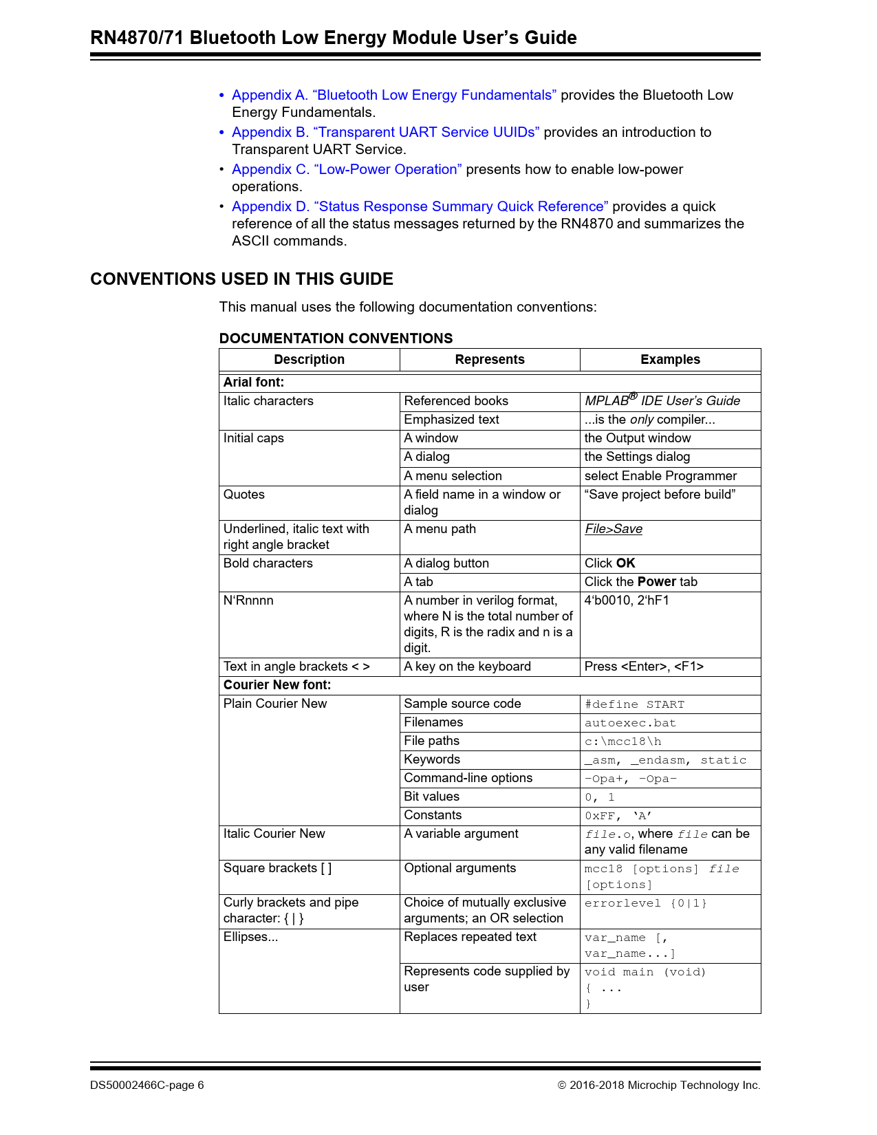 RN4870/71 Bluetooth Low Energy Module User’s Guide. CONVENTIONS USED IN THIS GUIDE. DOCUMENTATION CONVENTIONS. Description