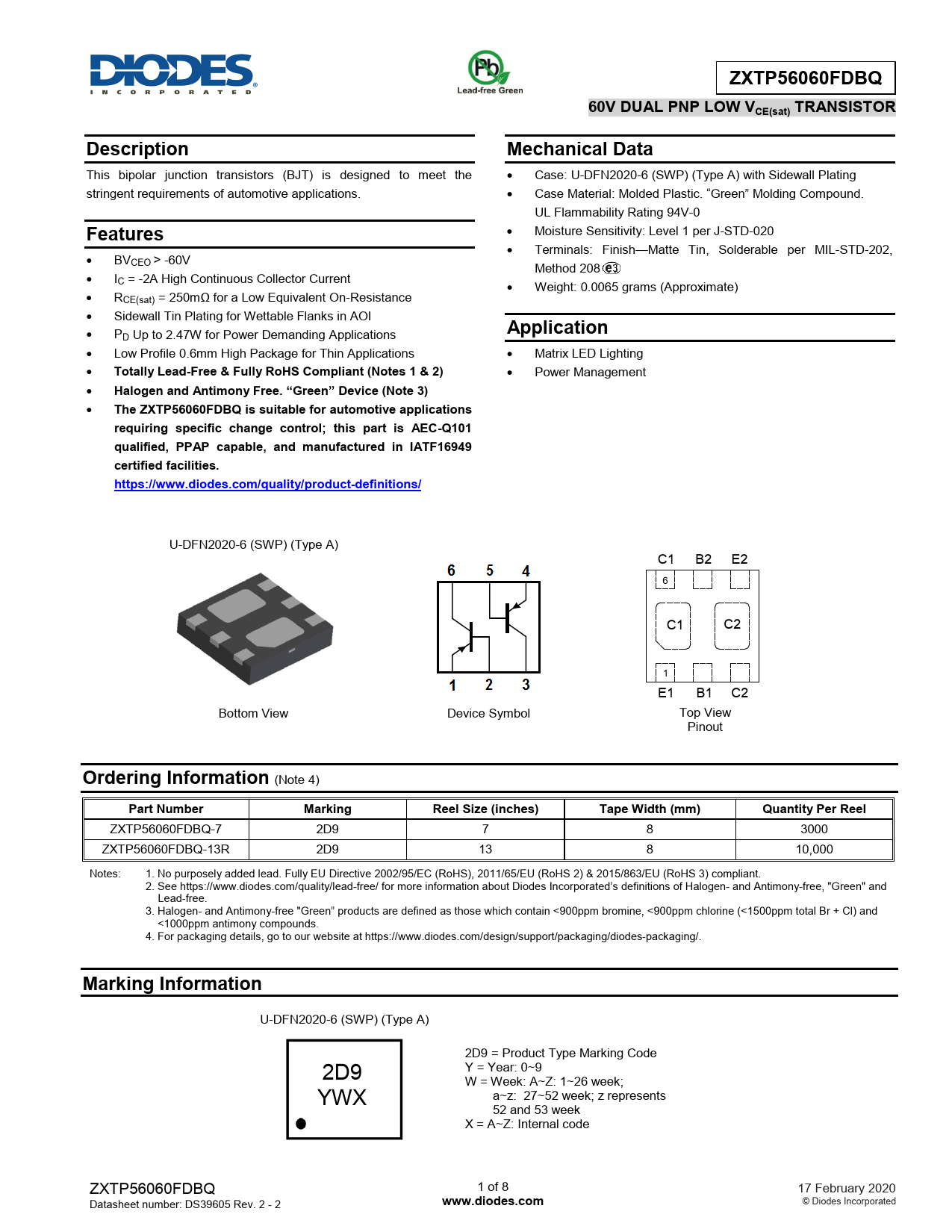 ZXTP56060FDBQ-7 2D9 7 8 3000 ZXTP56060FDBQ-13R 2D9 13 8 10,000 Notes: 1. No purposely added lead. Fully EU Directive 2002/95/EC (RoHS), 2011/65/EU (RoHS 2) & 2015/863/EU (RoHS 3) compliant. 2. See https://www.diodes.com/quality/lead-free/ for more information about Diodes Incorporated’s definitions of Halogen- and Antimony-free, "Green" and Lead-free. 3. Halogen- and Antimony-free "Green” products are defined as those which contain <900ppm bromine, <900ppm chlorine (<1500ppm total Br + Cl) and <1000ppm antimony compounds. 4. For packaging details, go to our website at https://www.diodes.com/design/support/packaging/diodes-packaging/.