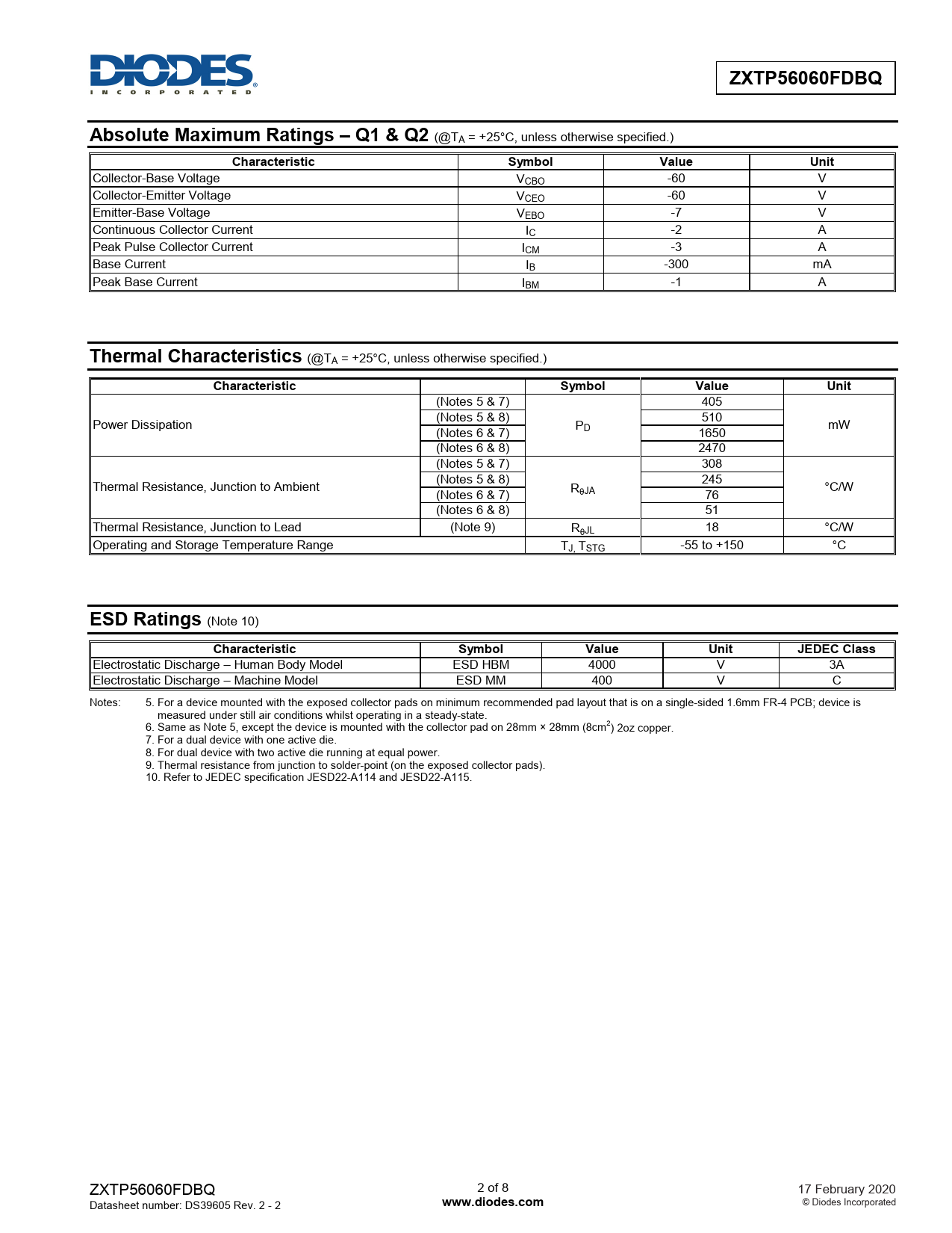Electrostatic Discharge – Human Body Model ESD HBM 4000 V 3A Electrostatic Discharge – Machine Model ESD MM 400 V C Notes: 5. For a device mounted with the exposed collector pads on minimum recommended pad layout that is on a single-sided 1.6mm FR-4 PCB; device is measured under stil air conditions whilst operating in a steady-state. 6. Same as Note 5, except the device is mounted with the collector pad on 28mm × 28mm (8cm2) 2oz copper. 7. For a dual device with one active die. 8. For dual device with two active die running at equal power. 9. Thermal resistance from junction to solder-point (on the exposed collector pads). 10. Refer to JEDEC specification JESD22-A114 and JESD22-A115. ZXTP56060FDBQ 2 of 8 17 February 2020 Datasheet number: DS39605 Rev. 2 - 2