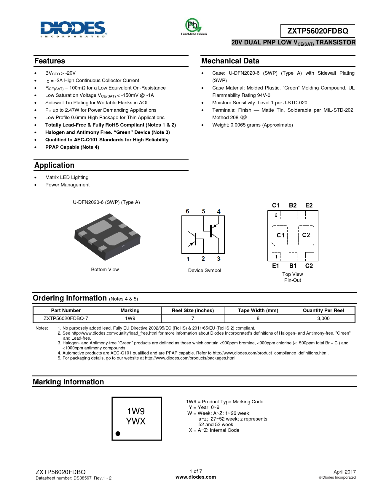 1W9 = Product Type Marking Code Y = Year: 0~9 1W9 W = Week: A~Z: 1~26 week; a~z; 27~52 week; z represents YWX 52 and 53 week X = A~Z: Internal Code ZXTP56020FDBQ 1 of 7 April 2017 Datasheet number: DS38567 Rev.1 - 2