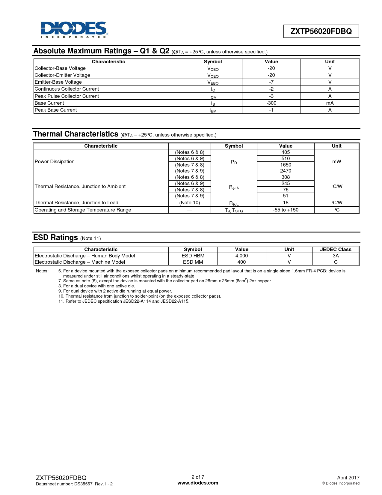ZXTP56020FDBQ. Absolute Maximum Ratings – Q1 & Q2. Characteristic. Symbol. Value. Unit. Thermal Characteristics. ESD Ratings