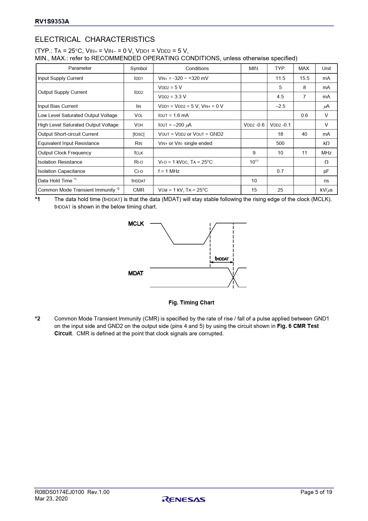 RV1S9353A Chapter Title ELECTRICAL CHARACTERISTICS (TYP.: TA = 25C, VIN = VIN = 0 V, VDD1 = VDD2 = 5 V, MIN., MAX.: refer to RECOMMENDED OPERATING CONDITIONS, unless otherwise specified) Parameter Symbol Conditions MIN. TYP. MAX. Unit Input Supply Current IDD1 VIN = -320 ~ +320 mV 11.5 15.5 mA VDD2 = 5 V 5 8 mA Output Supply Current IDD2 VDD2 = 3.3 V 4.5 7 mA Input Bias Current IIN VDD1 = VDD2 = 5 V, VIN+ = 0 V 2.5 A Low Level Saturated Output Voltage VOL IOUT = 1.6 mA 0.6 V High Level Saturated Output Voltage VOH IOUT = 200 A VDD2 -0.6 VDD2 -0.1 V Output Short-circuit Current |IOSC| VOUT = VDD2 or VOUT = GND2 18 40 mA Equivalent Input Resistance RIN VIN+ or VIN- single ended 500 k Output Clock Frequency fCLK 9 10 11 MHz Isolation Resistance RI-O VI-O = 1 kVDC, TA = 25C 1011 Isolation Capacitance CI-O f = 1 MHz 0.7 pF Data Hold Time *1 tHDDAT 10 ns Common Mode Transient Immunity *2 CMR VCM = 1 kV, TA = 25C 15 25 kV/s *1 The data hold time (tHDDAT) is that the data (MDAT) wil stay stable following the rising edge of the clock (MCLK). tHDDAT is shown in the below timing chart. Fig. Timing Chart *2 Common Mode Transient Immunity (CMR) is specified by the rate of rise / fall of a pulse applied between GND1 on the input side and GND2 on the output side (pins 4 and 5) by using the circuit shown in Fig. 6 CMR Test Circuit. CMR is defined at the point that clock signals are corrupted. R08DS0174EJ0100 Rev.1.00 Page 5 of 19 Mar 23, 2020