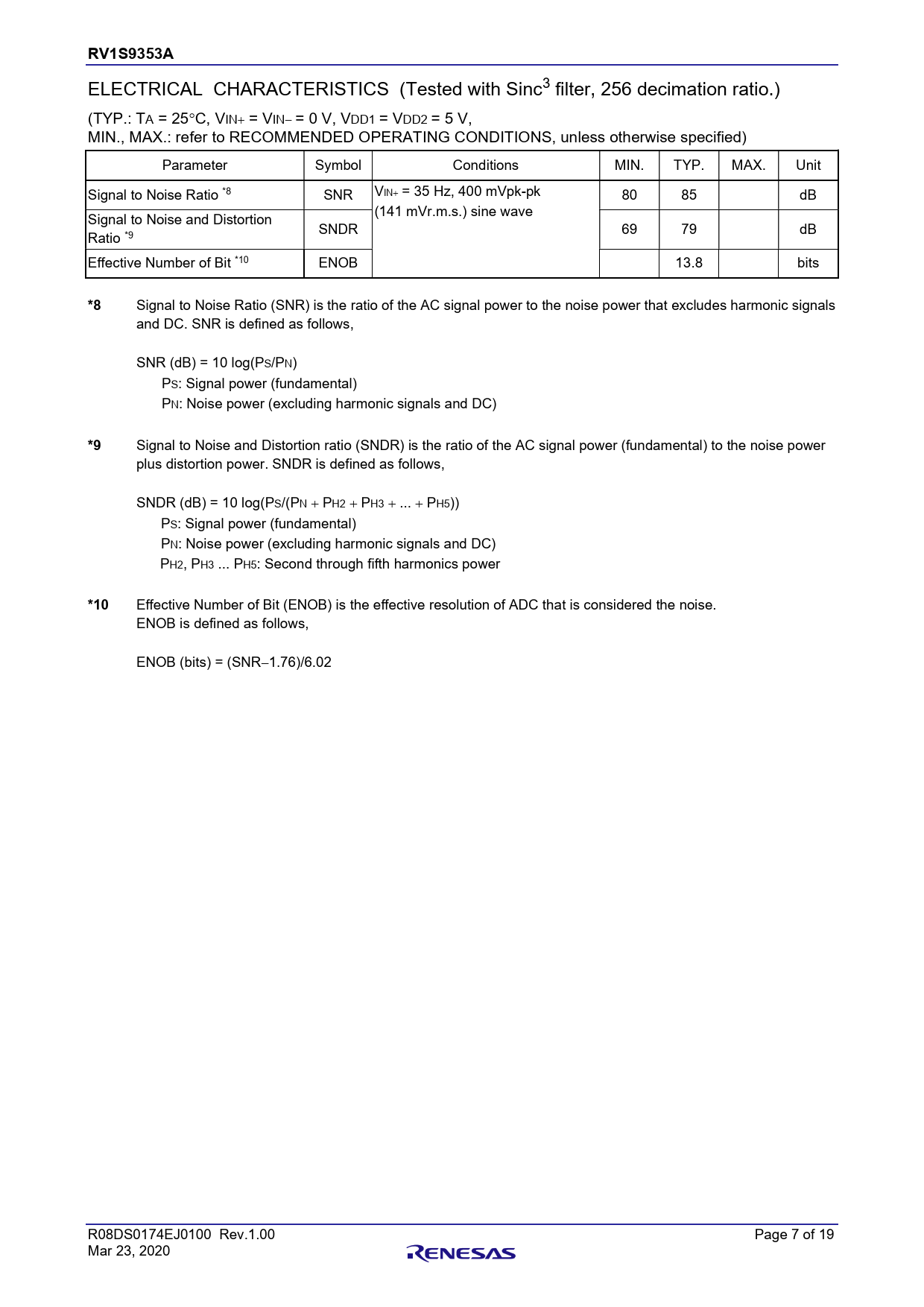 RV1S9353A Chapter Title ELECTRICAL CHARACTERISTICS (Tested with Sinc3 filter, 256 decimation ratio.) (TYP.: TA = 25C, VIN = VIN = 0 V, VDD1 = VDD2 = 5 V, MIN., MAX.: refer to RECOMMENDED OPERATING CONDITIONS, unless otherwise specified) Parameter Symbol Conditions MIN. TYP. MAX. Unit Signal to Noise Ratio *8 SNR VIN = 35 Hz, 400 mVpk-pk 80 85 dB (141 mVr.m.s.) sine wave Signal to Noise and Distortion SNDR 69 79 dB Ratio *9 Effective Number of Bit *10 ENOB 13.8 bits *8 Signal to Noise Ratio (SNR) is the ratio of the AC signal power to the noise power that excludes harmonic signals and DC. SNR is defined as follows, SNR (dB) = 10 log(PS/PN) PS: Signal power (fundamental) PN: Noise power (excluding harmonic signals and DC) *9 Signal to Noise and Distortion ratio (SNDR) is the ratio of the AC signal power (fundamental) to the noise power plus distortion power. SNDR is defined as follows, SNDR (dB) = 10 log(PS/(PN  PH2  PH3  ...  PH5)) PS: Signal power (fundamental) PN: Noise power (excluding harmonic signals and DC) PH2, PH3 ... PH5: Second through fifth harmonics power *10 Effective Number of Bit (ENOB) is the effective resolution of ADC that is considered the noise. ENOB is defined as fol ows, ENOB (bits) = (SNR1.76)/6.02 R08DS0174EJ0100 Rev.1.00 Page 7 of 19 Mar 23, 2020