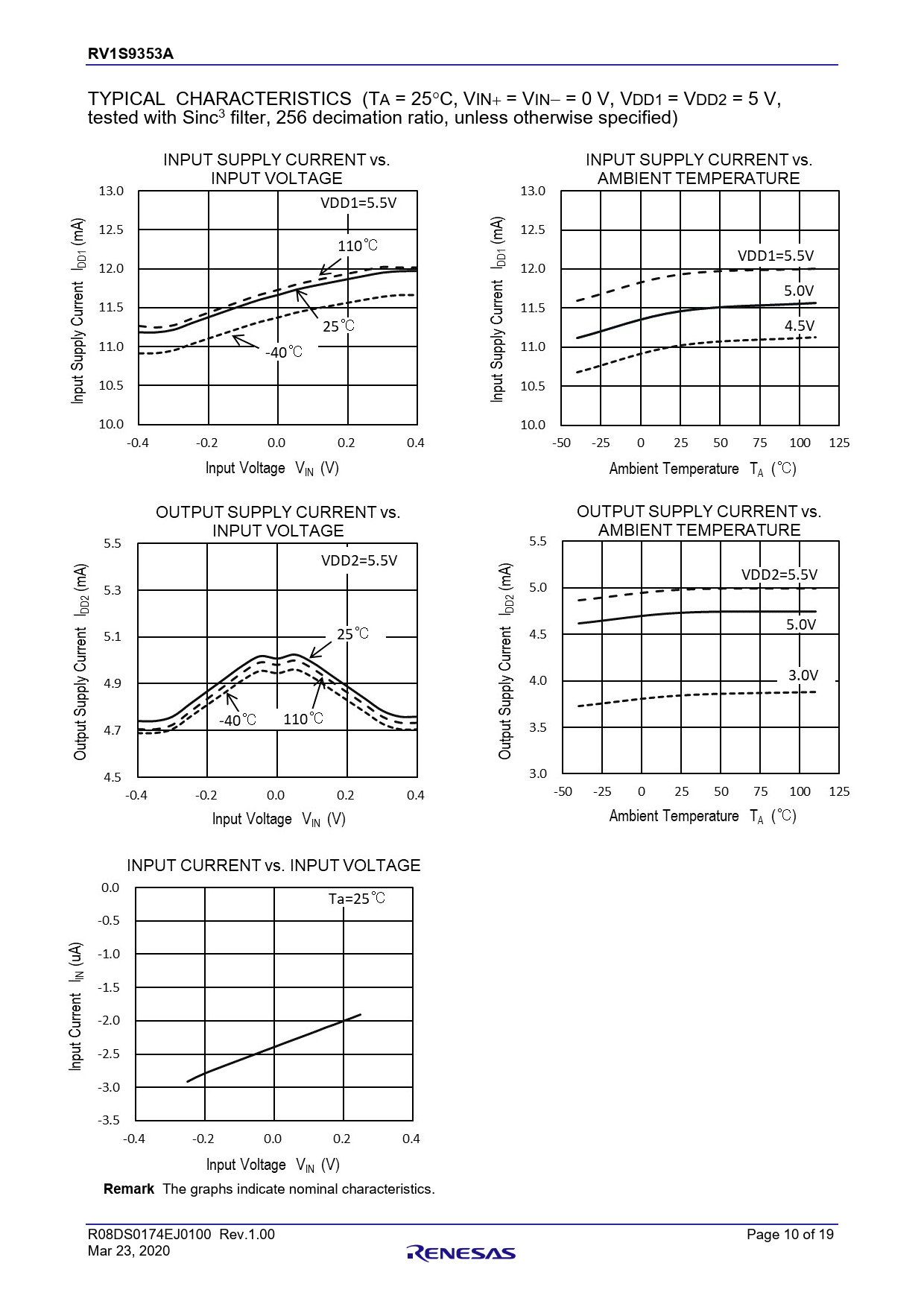 RV1S9353A Chapter Title TYPICAL CHARACTERISTICS (TA = 25C, VIN = VIN = 0 V, VDD1 = VDD2 = 5 V, tested with Sinc3 filter, 256 decimation ratio, unless otherwise specified) Remark The graphs indicate nominal characteristics. R08DS0174EJ0100 Rev.1.00 Page 10 of 19 Mar 23, 2020