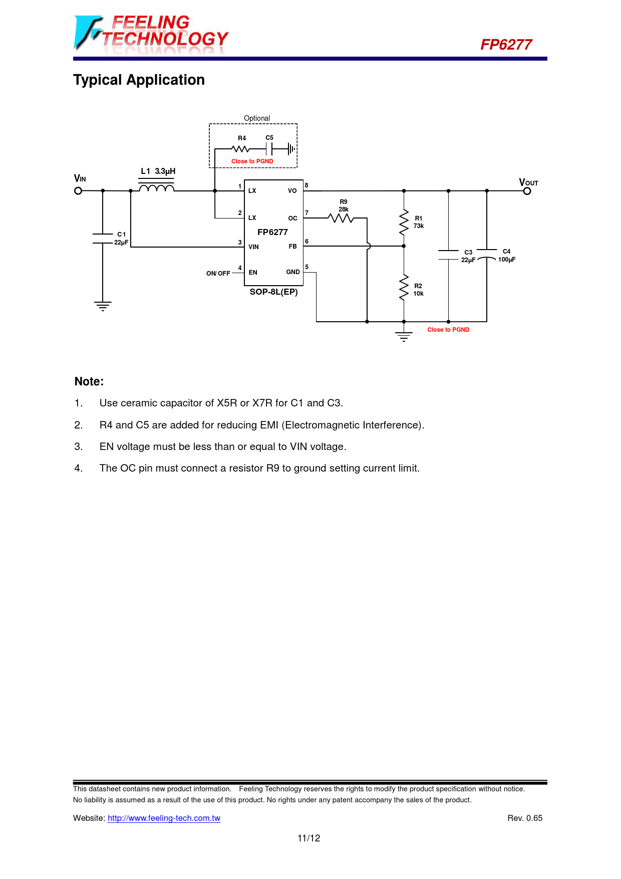 1. Use ceramic capacitor of X5R or X7R for C1 and C3. 2. R4 and C5 are added for reducing EMI (Electromagnetic Interference). 3. EN voltage must be less than or equal to VIN voltage. 4. The OC pin must connect a resistor R9 to ground setting current limit. This datasheet contains new product information. Feeling Technology reserves the rights to modify the product specification without notice.