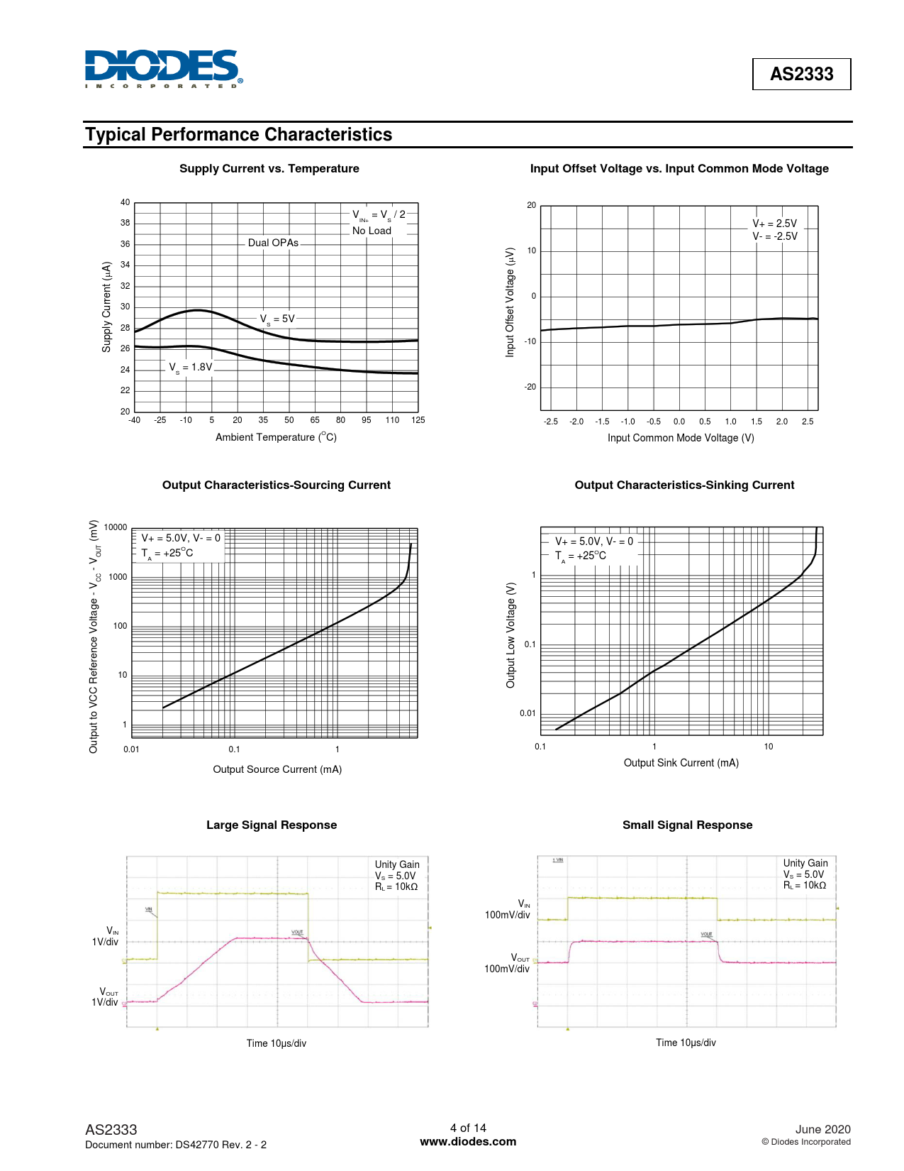 Uni ty Gai n Unity Gain V VS = 5.0V S = 5.0V R RL = 10kΩ L = 10kΩ VIN 100mV/div VIN 1V/div VOUT 100mV/div VOUT 1V/div Time 10μs/div Time 10μs/div AS2333 4 of 14 June 2020 Document number: DS42770 Rev. 2 - 2