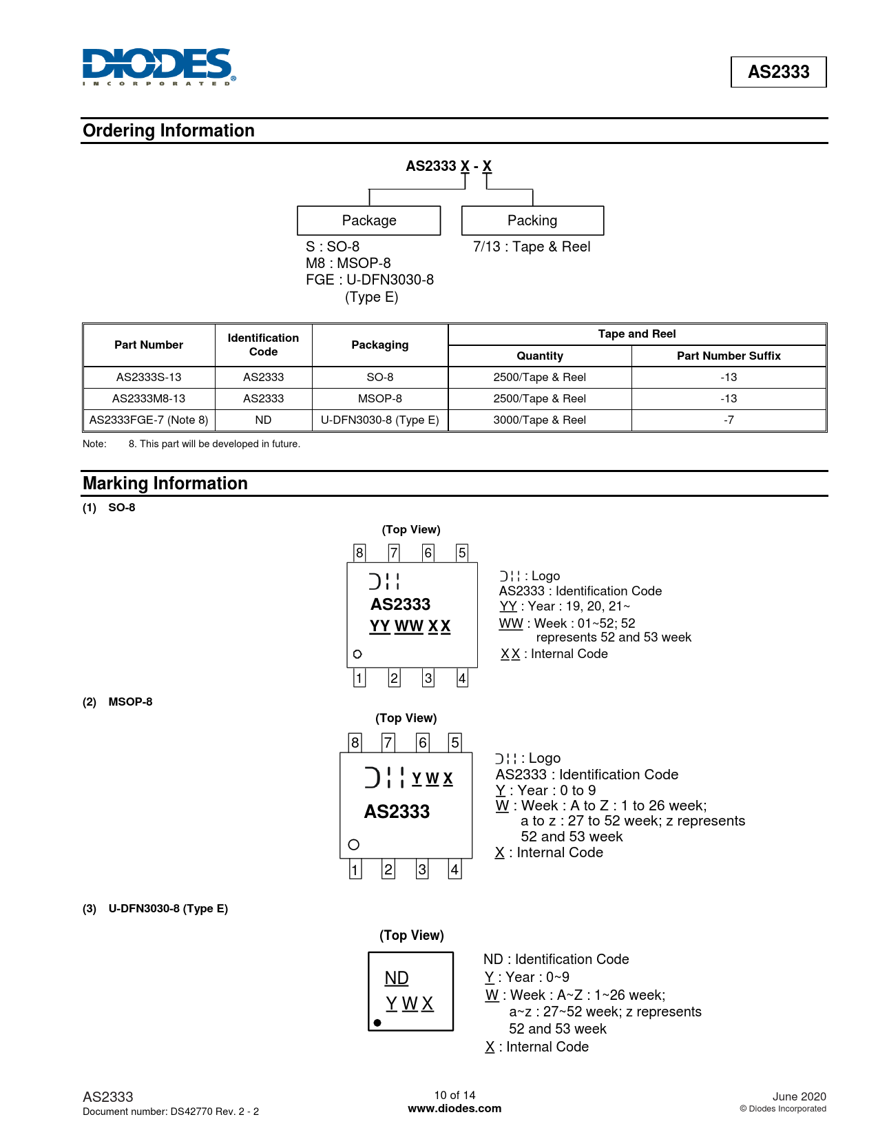 AS2333S-13 AS2333 SO-8 2500/Tape & Reel -13 AS2333M8-13 AS2333 MSOP-8 2500/Tape & Reel -13 AS2333FGE-7 (Note 8) ND U-DFN3030-8 (Type E) 3000/Tape & Reel -7 Note: 8. This part will be developed in future.