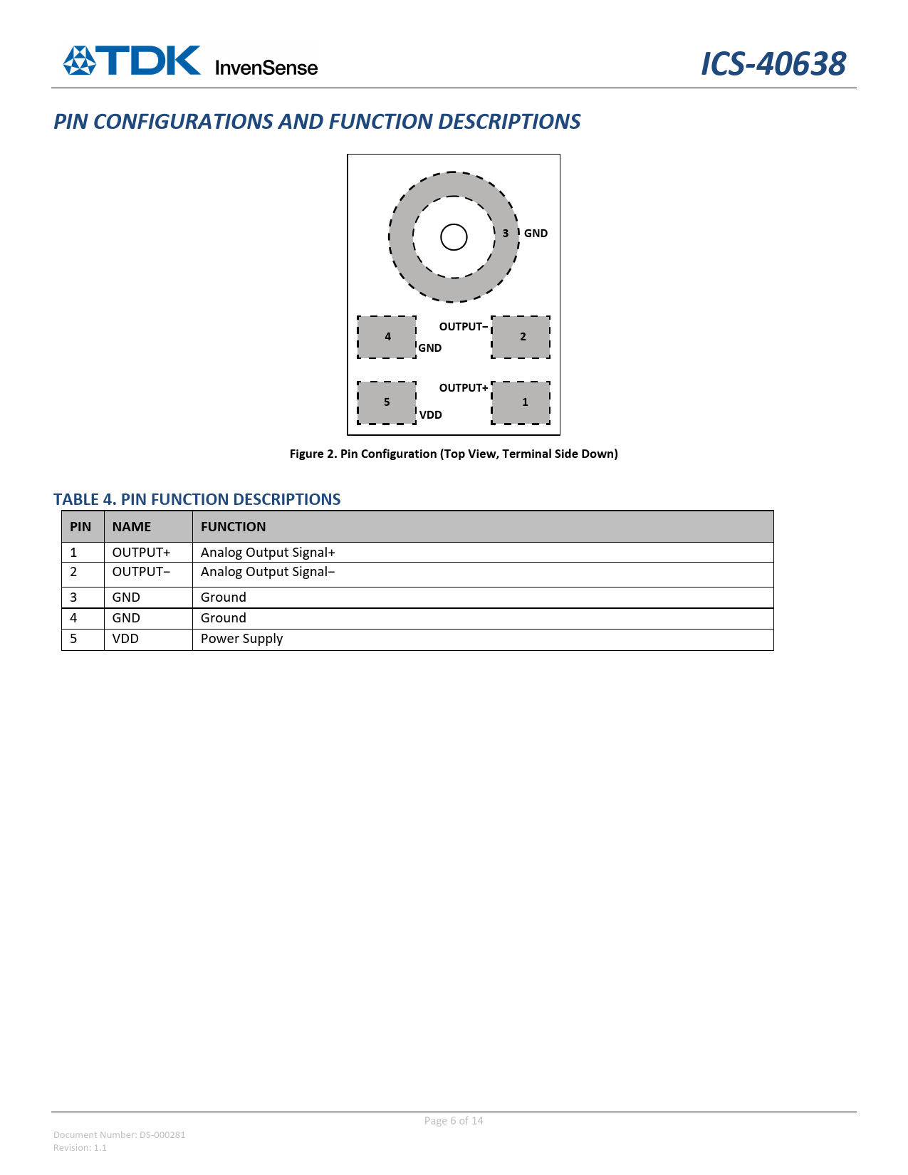 ICS‐40638. PIN CONFIGURATIONS AND FUNCTION DESCRIPTIONS . GND. OUTPUT−. OUTPUT+. VDD