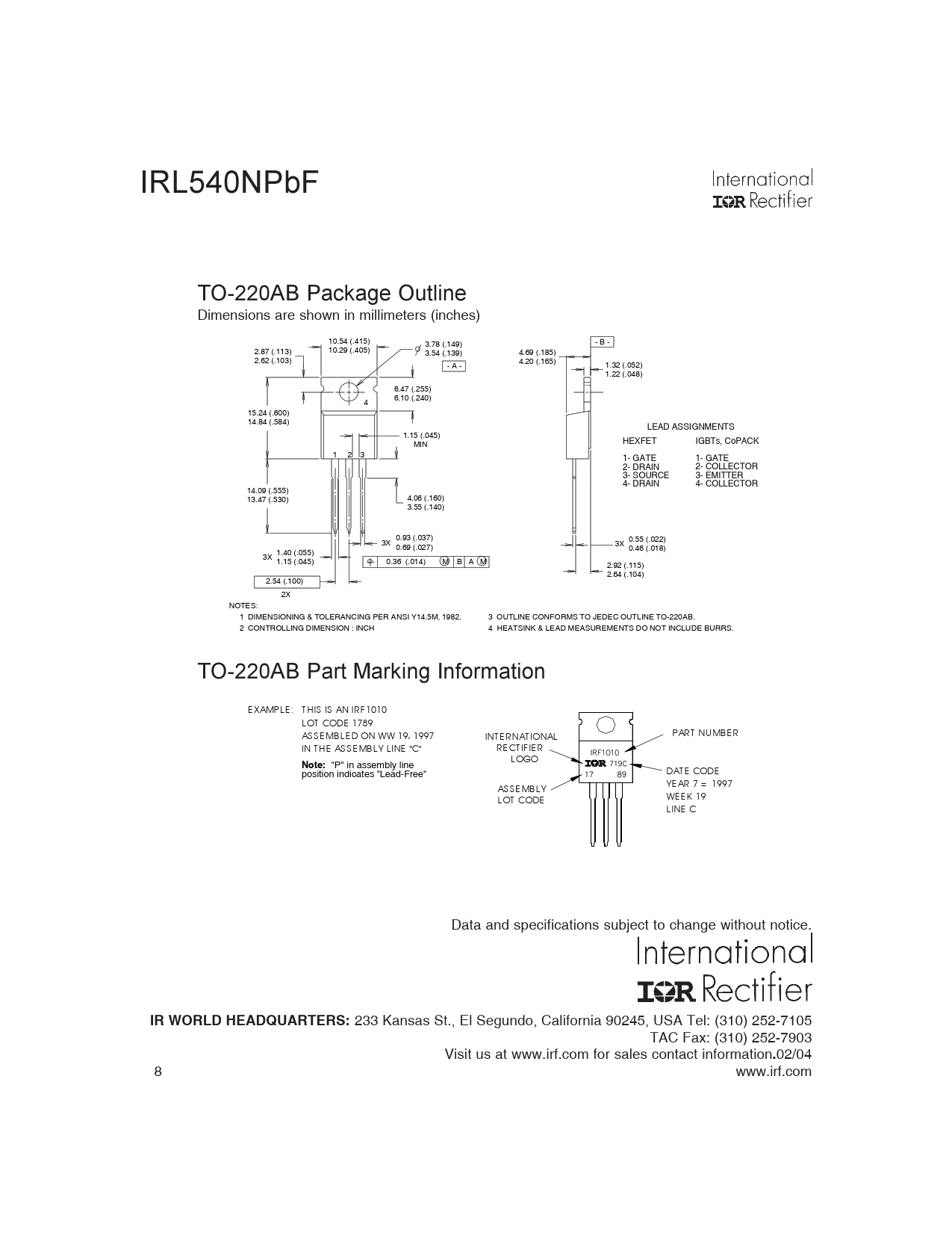 IRL540NPbF TO-220AB Package Outline Dimensions are shown in millimeters (inches) 10.54 (.415) - B - 3.78 (.149) 2.87 (.113) 10.29 (.405) 3.54 (.139) 4.69 (.185) 2.62 (.103) 4.20 (.165) - A - 1.32 (.052) 1.22 (.048) 6.47 (.255) 6.10 (.240) 4 15.24 (.600) 14.84 (.584) LEAD ASSIGNMENTS 1.15 (.045) LEAD ASSIGNMENTS MIN HEXFET IGBTs, CoPACK 1 - GATE 1 2 3 2 - DRAIN 1- GATE 1- GATE 2- 3 DRA - I S N OURCE 2- COLLECTOR 3- S O 4 - UR DR CEAIN 3- EMITTER 4- DRAIN 4- COLLECTOR 14.09 (.555) 4.06 (.160) 13.47 (.530) 3.55 (.140) 0.93 (.037) 0.55 (.022) 3X 3X 0.69 (.027) 0.46 (.018) 1.40 (.055) 3X 1.15 (.045) 0.36 (.014) M B A M 2.92 (.115) 2.64 (.104) 2.54 (.100) 2X NOTES: 1 DIMENSIONING & TOLERANCING PER ANSI Y14.5M, 1982. 3 OUTLINE CONFORMS TO JEDEC OUTLINE TO-220AB. 2 CONTROLLING DIMENSION : INCH 4 HEATSINK & LEAD MEASUREMENTS DO NOT INCLUDE BURRS. TO-220AB Part Marking Information E XAMPL E : T HIS IS AN IRF 1010 LOT CODE 1789 AS S E MB L E D ON WW 19, 1997 PART NU MB E R INT E RNAT IONAL IN T HE AS S E MB L Y LINE "C" RE CT IF IE R L OGO