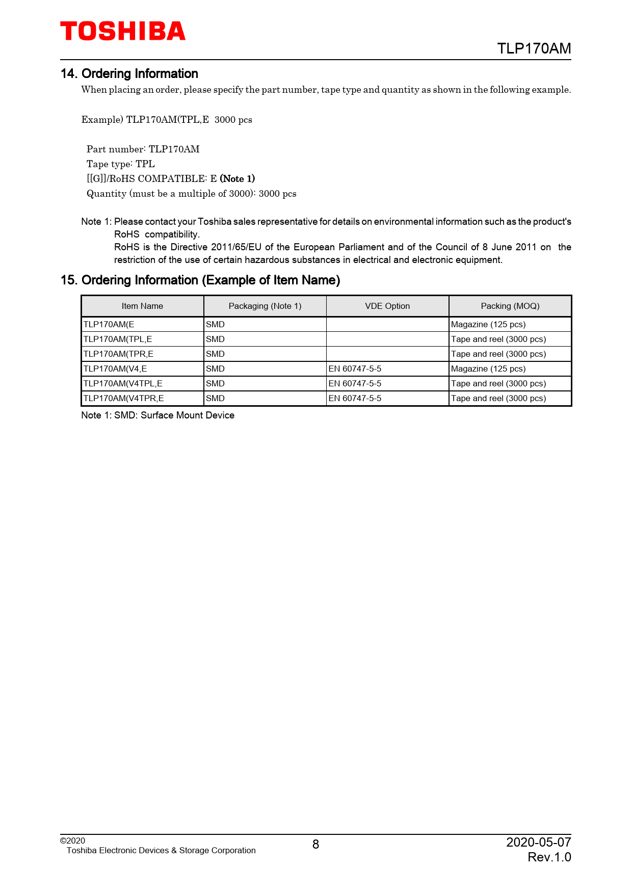 TLP170AM 14. Ordering Information When placing an order, please specify the part number, tape type and quantity as shown in the following example. Example) TLP170AM(TPL,E 3000 pcs Part number: TLP170AM Tape type: TPL [[G]]/RoHS COMPATIBLE: E (Note 1) Quantity (must be a multiple of 3000): 3000 pcs Note 1: Please contact your Toshiba sales representative for details on environmental information such as the product's RoHS compatibility. RoHS is the Directive 2011/65/EU of the European Parliament and of the Council of 8 June 2011 on the restriction of the use of certain hazardous substances in electrical and electronic equipment. 15. Ordering Information (Example of Item Name) Item Name Packaging (Note 1) VDE Option Packing (MOQ) TLP170AM(E SMD Magazine (125 pcs) TLP170AM(TPL,E SMD Tape and reel (3000 pcs) TLP170AM(TPR,E SMD Tape and reel (3000 pcs) TLP170AM(V4,E SMD EN 60747-5-5 Magazine (125 pcs) TLP170AM(V4TPL,E SMD EN 60747-5-5 Tape and reel (3000 pcs) TLP170AM(V4TPR,E SMD EN 60747-5-5 Tape and reel (3000 pcs) Note 1: SMD: Surface Mount Device ©2020 8 2020-05-07 Toshiba Electronic Devices & Storage Corporation Rev.1.0
