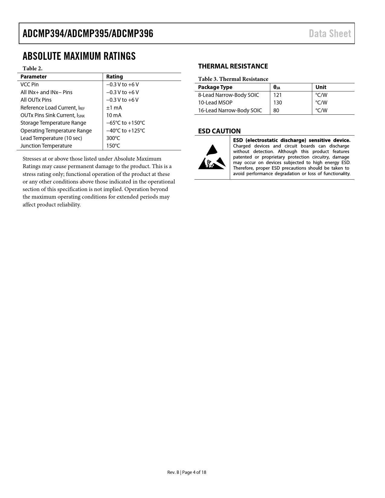 ADCMP394/ADCMP395/ADCMP396Data SheetABSOLUTE MAXIMUM RATINGS Table 2.THERMAL RESISTANCEParameterRatingTable 3. Thermal Resistance VCC Pin −0.3 V to +6 V Package TypeθJAUnit All INx+ and INx− Pins −0.3 V to +6 V 8-Lead Narrow-Body SOIC 121 °C/W All OUTx Pins −0.3 V to +6 V 10-Lead MSOP 130 °C/W Reference Load Current, IREF ±1 mA 16-Lead Narrow-Body SOIC 80 °C/W OUTx Pins Sink Current, ISINK 10 mA Storage Temperature Range −65°C to +150°C Operating Temperature Range −40°C to +125°C ESD CAUTION Lead Temperature (10 sec) 300°C Junction Temperature 150°C Stresses at or above those listed under Absolute Maximum Ratings may cause permanent damage to the product. This is a stress rating only; functional operation of the product at these or any other conditions above those indicated in the operational section of this specification is not implied. Operation beyond the maximum operating conditions for extended periods may affect product reliability. Rev. B | Page 4 of 18 Document Outline FEATURES APPLICATIONS GENERAL DESCRIPTION FUNCTIONAL BLOCK DIAGRAMS TABLE OF CONTENT REVISION HISTORY SPECIFICATIONS ABSOLUTE MAXIMUM RATINGS THERMAL RESISTANCE ESD CAUTION PIN CONFIGURATIONS AND FUNCTION DESCRIPTIONS TYPICAL PERFORMANCE CHARACTERISTICS THEORY OF OPERATION BASIC COMPARATOR RAIL-TO-RAIL INPUT (RRI) OPEN-DRAIN OUTPUT POWER-UP BEHAVIOR CROSSOVER BIAS POINT COMPARATOR HYSTERESIS TYPICAL APPLICATIONS ADDING HYSTERESIS WINDOW COMPARATOR FOR POSITIVE VOLTAGE MONITORING WINDOW COMPARATOR FOR NEGATIVE VOLTAGE MONITORING PROGRAMMABLE SEQUENCING CONTROL CIRCUIT MIRRORED VOLTAGE SEQUENCER EXAMPLE THRESHOLD AND TIMEOUT PROGRAMMABLE VOLTAGE SUPERVISOR OUTLINE DIMENSIONS ORDERING GUIDE