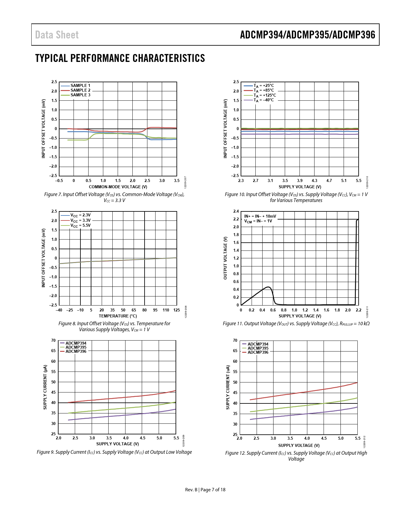 Data SheetADCMP394/ADCMP395/ADCMP396TYPICAL PERFORMANCE CHARACTERISTICS2.52.5SAMPLE 1TA = +25°C2.0SAMPLE 22.0TA = +85°CSAMPLE 3TA = +125°C1.5V)1.5V)TA = –40°C(m(mE1.0E1.0GGAAT0.5TL0.5LVO0VO0SETSETF–0.5F–0.5FFOOT–1.0T–1.0PUPUIN–1.5IN–1.5–2.0–2.0–2.5–2.5–0.500.51.01.52.02.53.03.5 207 2.32.73.13.53.94.34.75.15.5 210 9- 9- COMMON-MODE VOLTAGE (V)SUPPLY VOLTAGE (V) 1220 1220 Figure 7. Input Offset Voltage (VOS) vs. Common-Mode Voltage (VCM), Figure 10. Input Offset Voltage (VOS) vs. Supply Voltage (VCC), VCM = 1 V VCC = 3.3 V for Various Temperatures 2.52.4VCC = 2.3VIN+ = IN– + 10mV2.0V2.2CC = 3.3VVCM = IN– = 1VV)CC = 5.5V2.01.5V m1.8(1.0(V)GE1.6E0.5GLTAA1.4OT LV0T1.2EVO T–0.51.0FFSPU T0.8T O–1.0UUOP0.6IN–1.50.4–2.00.2–2.50 1 –40 –25 –105203550658095110 125 1 208 00.20.40.60.81.01.21.41.61.82.02.2 2 9- 9- TEMPERATURE (°C)SUPPLY VOLTAGE (V) 1220 1220 Figure 8. Input Offset Voltage (VOS) vs. Temperature for Figure 11. Output Voltage (VOUT) vs. Supply Voltage (VCC), RPULLUP = 10 kΩ Various Supply Voltages, VCM = 1 V 7070ADCMP394ADCMP394ADCMP395ADCMP39565ADCMP39665ADCMP3966060A) µA)(5555(uNTNT5050RRERRECU45CU 45Y LLYPPP4040UUPSS3535303025 9 252.02.53.03.54.04.55.05.5 20 2.02.53.03.54.04.55.05.5 12 2 SUPPLY VOLTAGE (V) 2209- 1 SUPPLY VOLTAGE (V) 2209- 1 Figure 9. Supply Current (ICC) vs. Supply Voltage (VCC) at Output Low Voltage Figure 12. Supply Current (ICC) vs. Supply Voltage (VCC) at Output High Voltage Rev. B | Page 7 of 18 Document Outline FEATURES APPLICATIONS GENERAL DESCRIPTION FUNCTIONAL BLOCK DIAGRAMS TABLE OF CONTENT REVISION HISTORY SPECIFICATIONS ABSOLUTE MAXIMUM RATINGS THERMAL RESISTANCE ESD CAUTION PIN CONFIGURATIONS AND FUNCTION DESCRIPTIONS TYPICAL PERFORMANCE CHARACTERISTICS THEORY OF OPERATION BASIC COMPARATOR RAIL-TO-RAIL INPUT (RRI) OPEN-DRAIN OUTPUT POWER-UP BEHAVIOR CROSSOVER BIAS POINT COMPARATOR HYSTERESIS TYPICAL APPLICATIONS ADDING HYSTERESIS WINDOW COMPARATOR FOR POSITIVE VOLTAGE MONITORING WINDOW COMPARATOR FOR NEGATIVE VOLTAGE MONITORING PROGRAMMABLE SEQUENCING CONTROL CIRCUIT MIRRORED VOLTAGE SEQUENCER EXAMPLE THRESHOLD AND TIMEOUT PROGRAMMABLE VOLTAGE SUPERVISOR OUTLINE DIMENSIONS ORDERING GUIDE