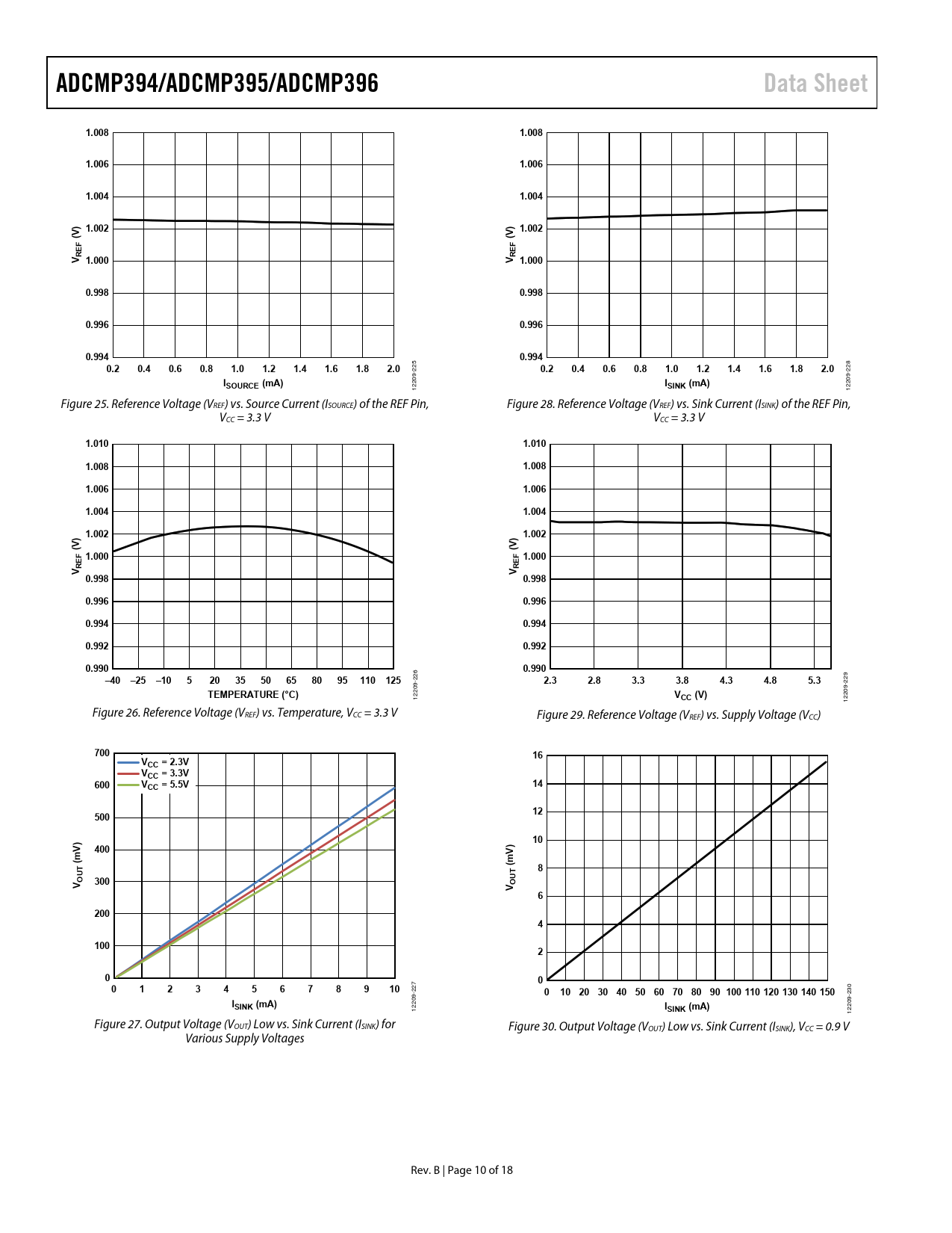 ADCMP394/ADCMP395/ADCMP396Data Sheet1.0081.0081.0061.0061.0041.004) 1.002) 1.002(V(VFFREREV 1.000V 1.0000.9980.9980.9960.9960.9940.9940.20.40.60.81.01.21.41.61.82.0 -225 0.20.40.60.81.01.21.41.61.82.0 -228 ISOURCE (mA)ISINK (mA) 12209 12209 Figure 25. Reference Voltage (VREF) vs. Source Current (ISOURCE) of the REF Pin, Figure 28. Reference Voltage (VREF) vs. Sink Current (ISINK) of the REF Pin, VCC = 3.3 V VCC = 3.3 V 1.0101.0101.0081.0081.0061.0061.0041.0041.0021.002)(V)(VF 1.000F 1.000REREVV0.9980.9980.9960.9960.9940.9940.9920.9920.9900.990–40 –25 –105203550658095110 125 226 2.32.83.33.84.34.85.3 9- -229 TEMPERATURE (°C)V 1220 CC (V) 12209 Figure 26. Reference Voltage (VREF) vs. Temperature, VCC = 3.3 V Figure 29. Reference Voltage (VREF) vs. Supply Voltage (VCC) 70016VCC = 2.3VVCC = 3.3V600VCC = 5.5V1412500)10V400) V(m T(m T8OU300VOUV62004100200012345678910 -227 010 20 30 40 50 60 70 80 90 100 110 120 130 140 150 -230 ISINK (mA)I 12209 SINK (mA) 12209 Figure 27. Output Voltage (VOUT) Low vs. Sink Current (ISINK) for Figure 30. Output Voltage (VOUT) Low vs. Sink Current (ISINK), VCC = 0.9 V Various Supply Voltages Rev. B | Page 10 of 18 Document Outline FEATURES APPLICATIONS GENERAL DESCRIPTION FUNCTIONAL BLOCK DIAGRAMS TABLE OF CONTENT REVISION HISTORY SPECIFICATIONS ABSOLUTE MAXIMUM RATINGS THERMAL RESISTANCE ESD CAUTION PIN CONFIGURATIONS AND FUNCTION DESCRIPTIONS TYPICAL PERFORMANCE CHARACTERISTICS THEORY OF OPERATION BASIC COMPARATOR RAIL-TO-RAIL INPUT (RRI) OPEN-DRAIN OUTPUT POWER-UP BEHAVIOR CROSSOVER BIAS POINT COMPARATOR HYSTERESIS TYPICAL APPLICATIONS ADDING HYSTERESIS WINDOW COMPARATOR FOR POSITIVE VOLTAGE MONITORING WINDOW COMPARATOR FOR NEGATIVE VOLTAGE MONITORING PROGRAMMABLE SEQUENCING CONTROL CIRCUIT MIRRORED VOLTAGE SEQUENCER EXAMPLE THRESHOLD AND TIMEOUT PROGRAMMABLE VOLTAGE SUPERVISOR OUTLINE DIMENSIONS ORDERING GUIDE