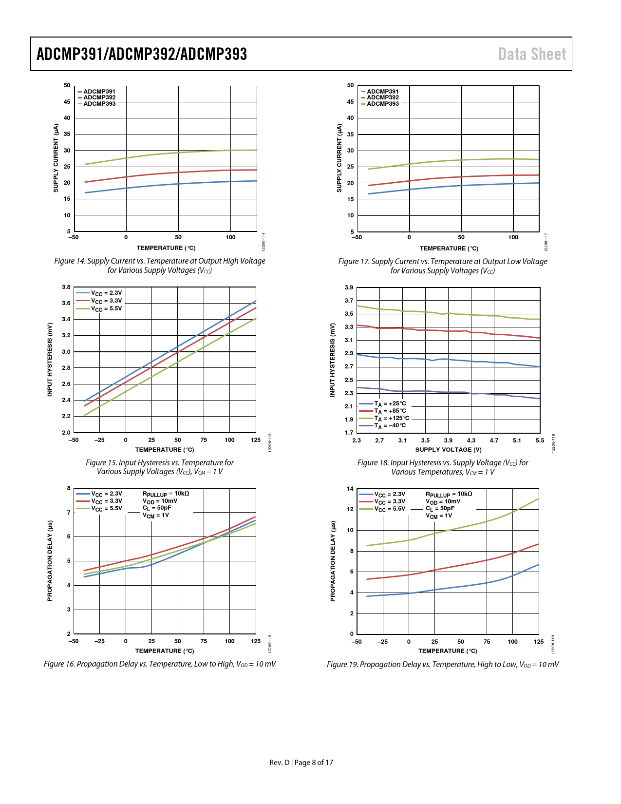 ADCMP391/ADCMP392/ADCMP393Data Sheet5050ADCMP391ADCMP391ADCMP392ADCMP39245ADCMP39345ADCMP3934040A)A)µ35µ(35(NTNT3030CURRE25CURRE25YYLLPP20PP20SUSU1515101055 14 –50050100 1 17 –50050100 1 TEMPERATURE (°C) 12206- TEMPERATURE (°C) 12206- Figure 14. Supply Current vs. Temperature at Output High Voltage Figure 17. Supply Current vs. Temperature at Output Low Voltage for Various Supply Voltages (VCC) for Various Supply Voltages (VCC) 3.83.9VCC = 2.3V3.6VCC = 3.3V3.7VCC = 5.5V3.53.4V)V)3.33.2S (mS (m3.1ESI3.0ESI2.9ERER2.82.7YSTYSTHHTT2.52.6PUPUIN2.3IN2.4T2.1A = +25°CTA = +85°C2.21.9TA = +125°C TA = –40°C2.01.7 15 18 –50–250255075100125 1 2.32.73.13.53.94.34.75.15.5 1 TEMPERATURE (°C) 12206- SUPPLY VOLTAGE (V) 12206- Figure 15. Input Hysteresis vs. Temperature for Figure 18. Input Hysteresis vs. Supply Voltage (VCC) for Various Supply Voltages (VCC), VCM = 1 V Various Temperatures, VCM = 1 V 814VCC = 2.3VRPULLUP = 10kΩVCC = 2.3VRPULLUP = 10kΩVCC = 3.3VVOD = 10mVVCC = 3.3VVOD = 10mVVC12VC7CC = 5.5VL = 50pFCC = 5.5VL = 50pFVCM = 1VVCM = 1Vs)s)µµ(10(6AYAYLL8N DE5N DEIOIOAT6ATAGAGP4PRO4ROPP3220 16 19 –50–250255075100125 1 –50–250255075100125 1 TEMPERATURE (°C) 12206- TEMPERATURE (°C) 12206- Figure 16. Propagation Delay vs. Temperature, Low to High, VOD = 10 mV Figure 19. Propagation Delay vs. Temperature, High to Low, VOD = 10 mV Rev. D | Page 8 of 17 Document Outline FEATURES APPLICATIONS GENERAL DESCRIPTION FUNCTIONAL BLOCK DIAGRAMS REVISION HISTORY SPECIFICATIONS ABSOLUTE MAXIMUM RATINGS THERMAL RESISTANCE ESD CAUTION PIN CONFIGURATIONS AND FUNCTION DESCRIPTIONS TYPICAL PERFORMANCE CHARACTERISTICS THEORY OF OPERATION BASIC COMPARATOR RAIL-TO-RAIL INPUT (RRI) OPEN-DRAIN OUTPUT POWER-UP BEHAVIOR CROSSOVER BIAS POINT COMPARATOR HYSTERESIS TYPICAL APPLICATIONS ADDING HYSTERESIS WINDOW COMPARATOR FOR POSITIVE VOLTAGE MONITORING WINDOW COMPARATOR FOR NEGATIVE VOLTAGE MONITORING PROGRAMMABLE SEQUENCING CONTROL CIRCUIT MIRRORED VOLTAGE SEQUENCER EXAMPLE THRESHOLD AND TIMEOUT PROGRAMMABLE VOLTAGE SUPERVISOR OUTLINE DIMENSIONS ORDERING GUIDE