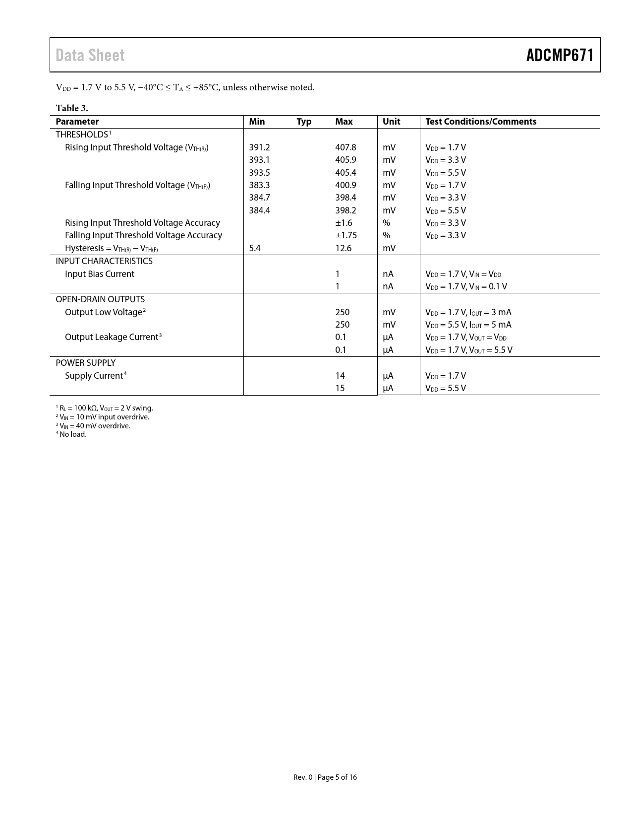 Data Sheet. ADCMP671. Table 3. Parameter Min. Typ. Max. Unit. Test. Conditions/Comments