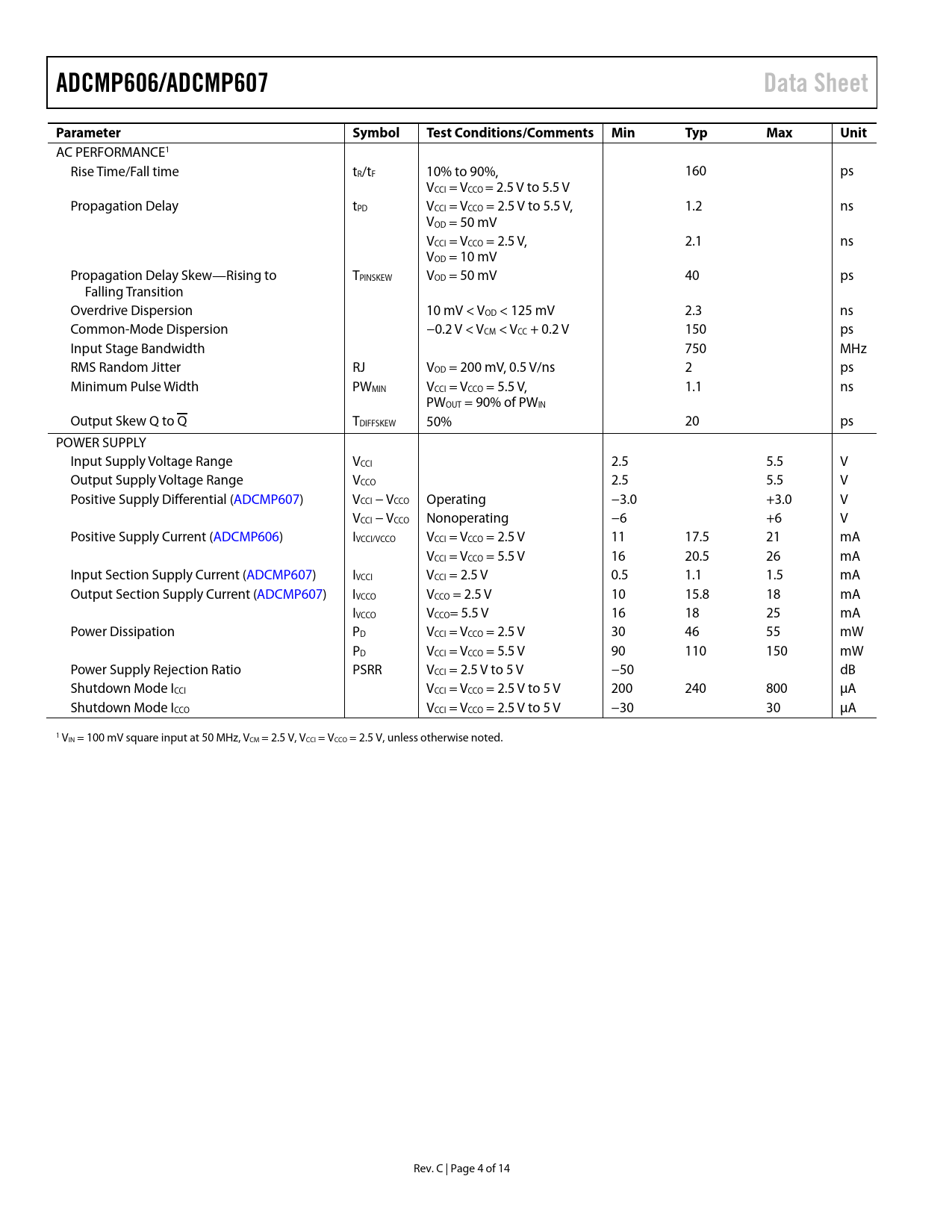 | 页数 / 页 | 14 / 4 — ADCMP606/ADCMP607. Data Sheet. Parameter. Symbol. Test … |