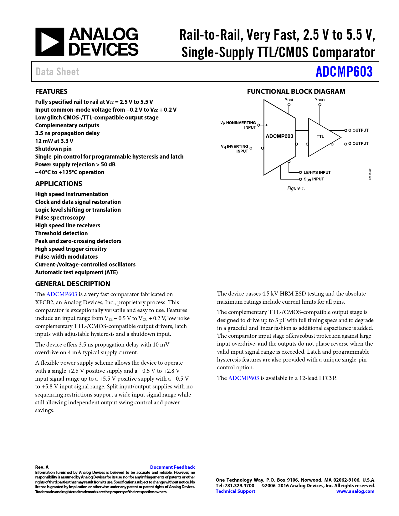 Rail-to-Rail, Very Fast, 2.5 V to 5.5 V,. Single-Supply TTL/CMOS Comparator. Data Sheet. ADCMP603. FEATURES