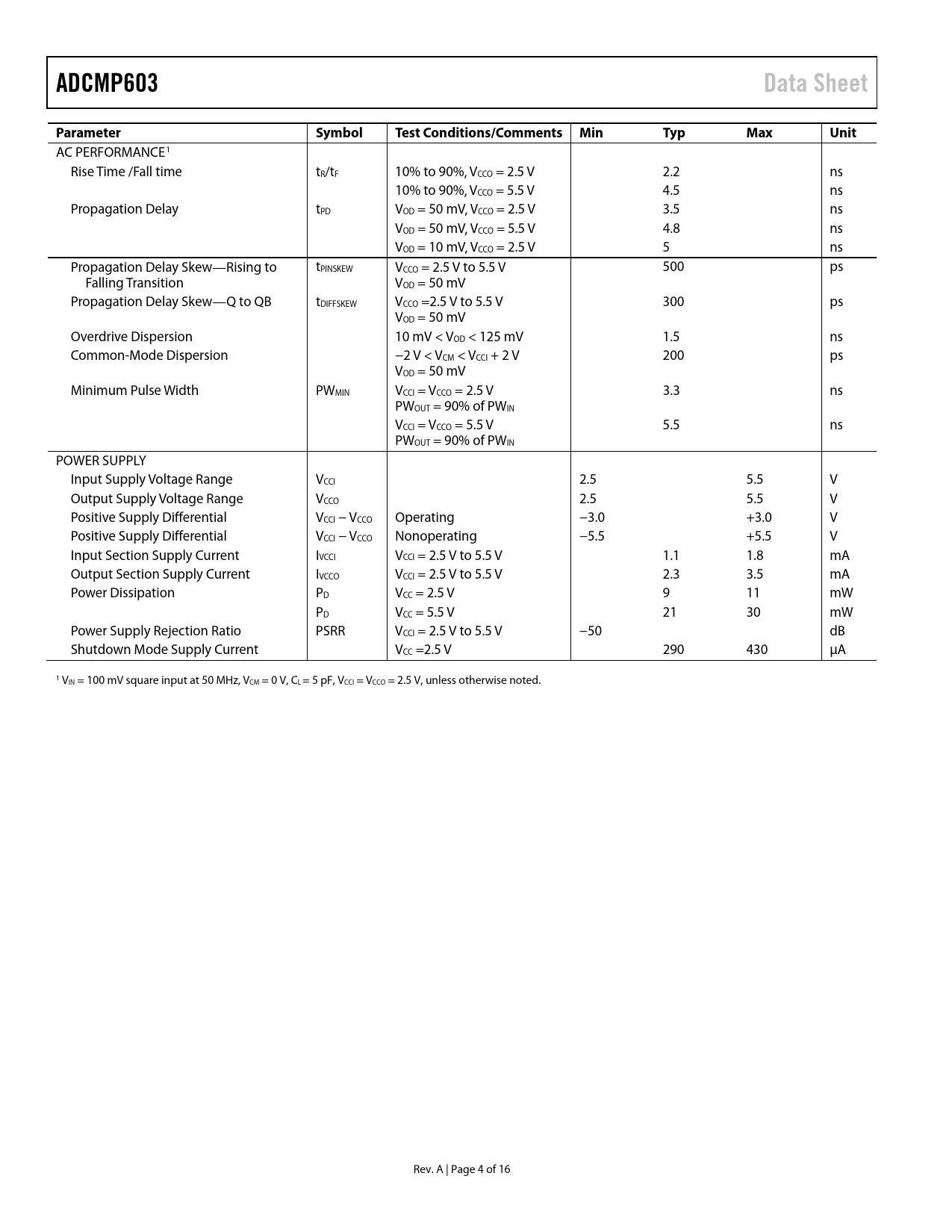 ADCMP603 Data Sheet Parameter Symbol Test Conditions/Comments Min Typ Max Unit