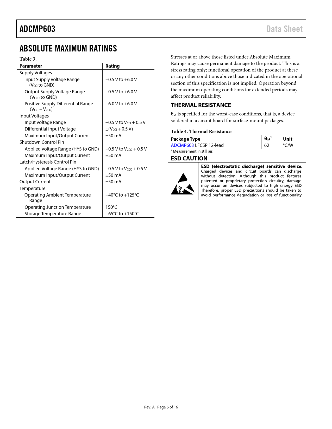 ADCMP603. Data Sheet. ABSOLUTE MAXIMUM RATINGS Table 3. Parameter. Rating. THERMAL RESISTANCE. Table 4. Thermal Resistance