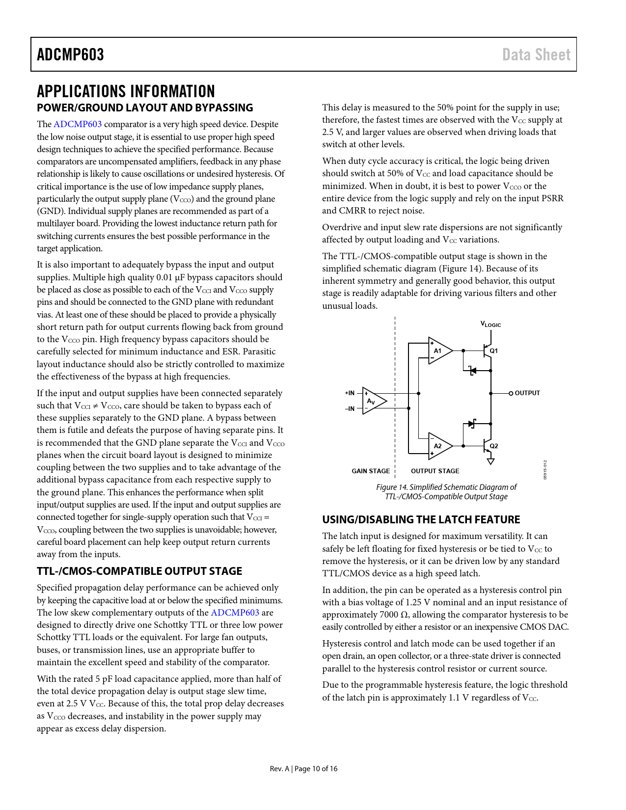 ADCMP603. Data Sheet. APPLICATIONS INFORMATION POWER/GROUND LAYOUT AND BYPASSING. VLOGIC. +IN. OUTPUT. –IN. GAIN STAGE. OUTPUT STAGE